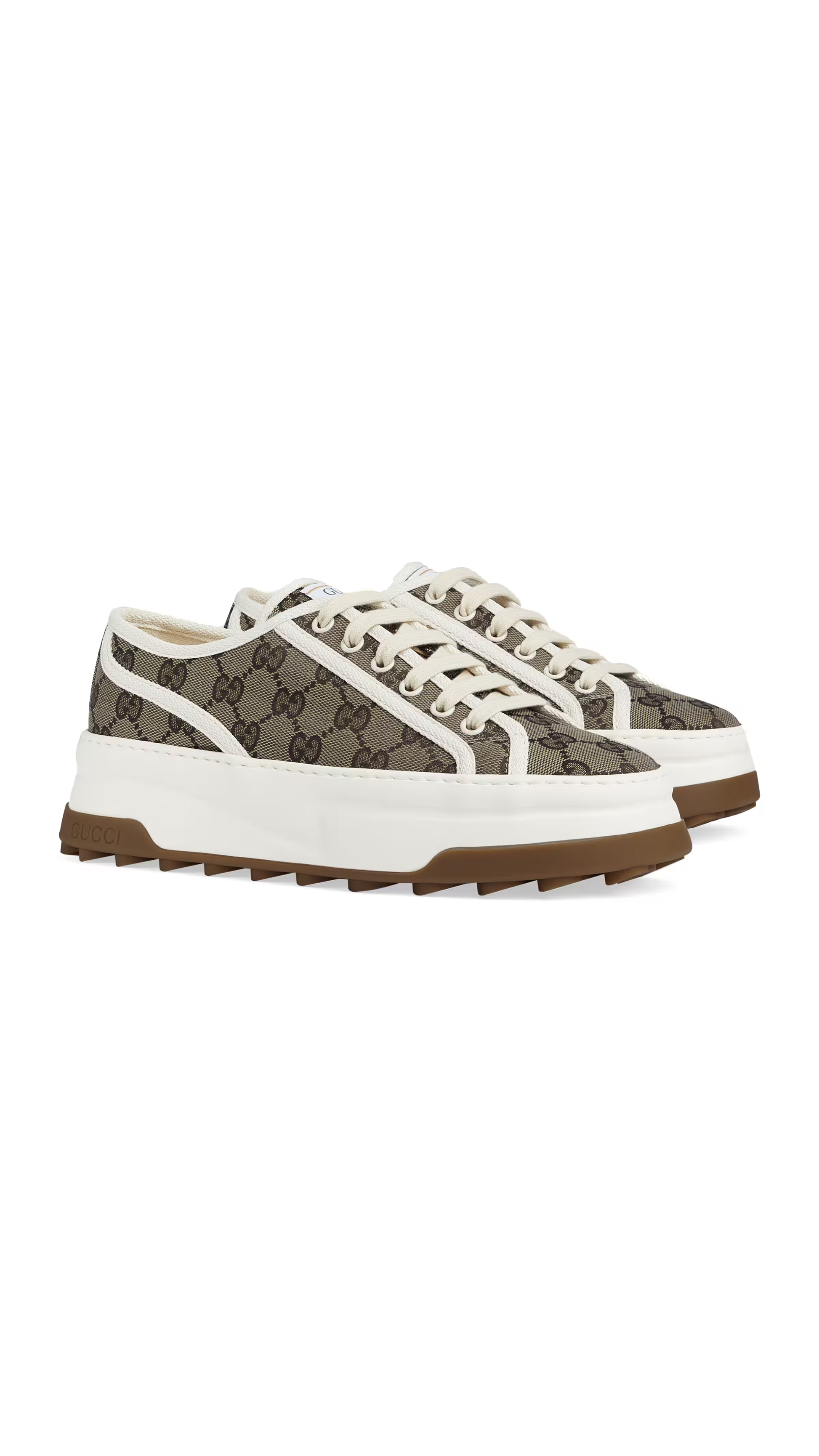 Sneakers by Gucci, round toe, textured sole with checkering, lace-up front closure, iconic all-over printed GG Supreme graphic pattern, contrasting sole.