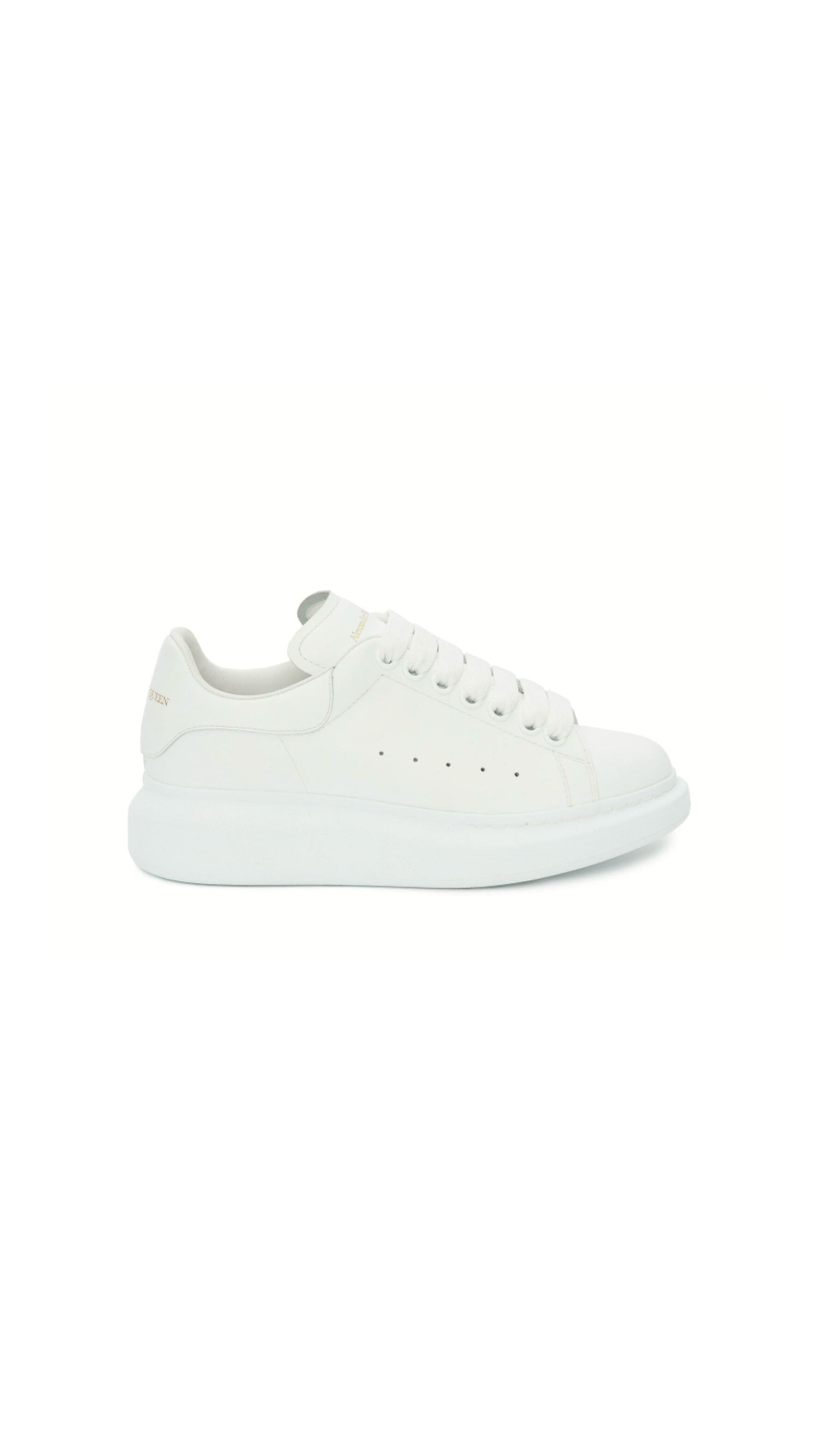 Calfskin Sneakers by Alexander McQueen, round toe, gold-tone logo printed on front and back, lace up closure, black detail on back, high sole.