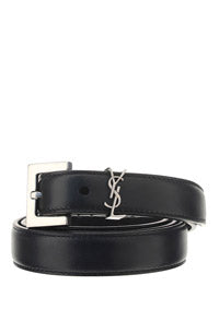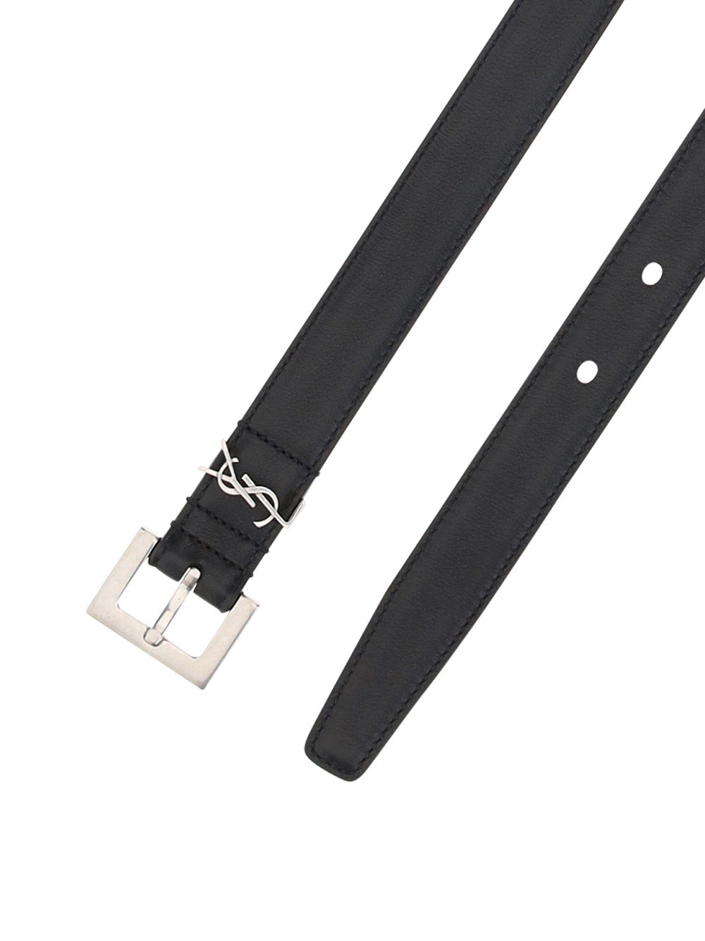 Calfskin Belt by Saint Laurent, metallic rectangular buckle, iconic brand monogram applied to the front in relief. Thickness: 2 cm.