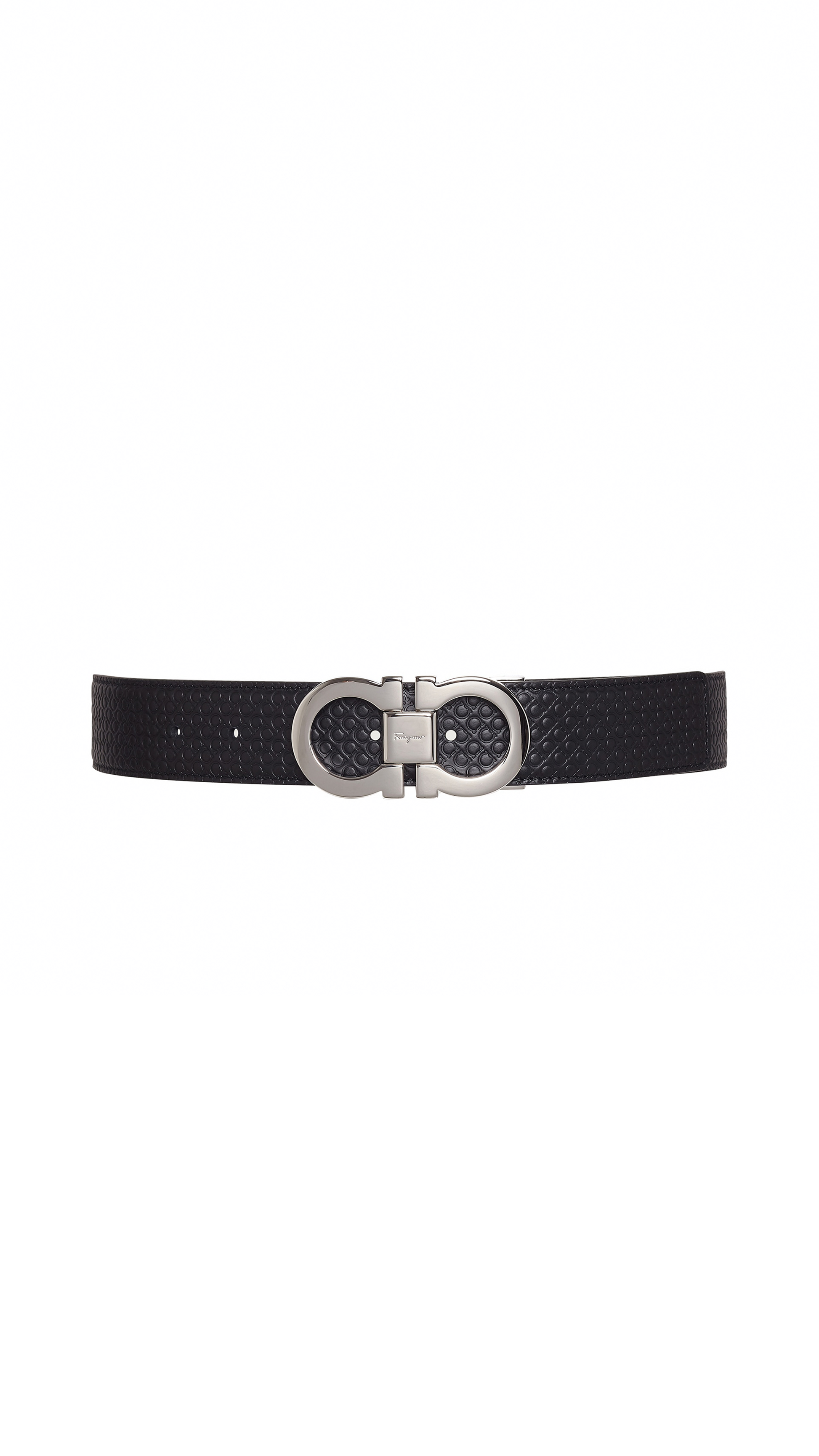 Men's Calfskin Belt by Salvatore Ferragamo, reversible pattern, iconic all-over pressure-printed brand logo design, brand signature engraved on buckle. Thickness: 3.5 cm.
