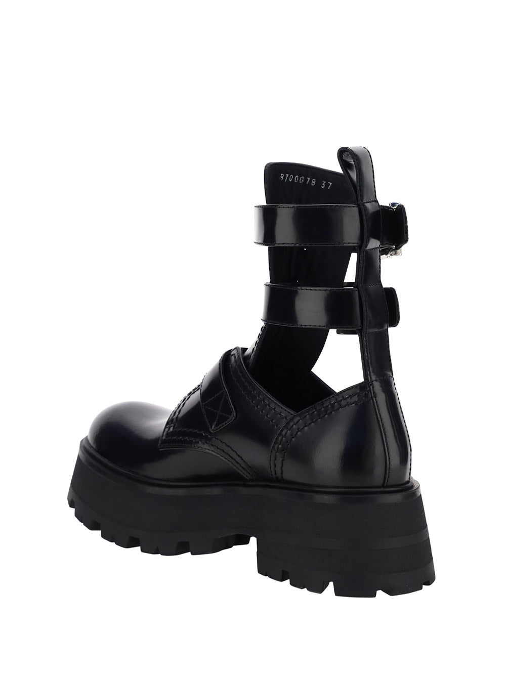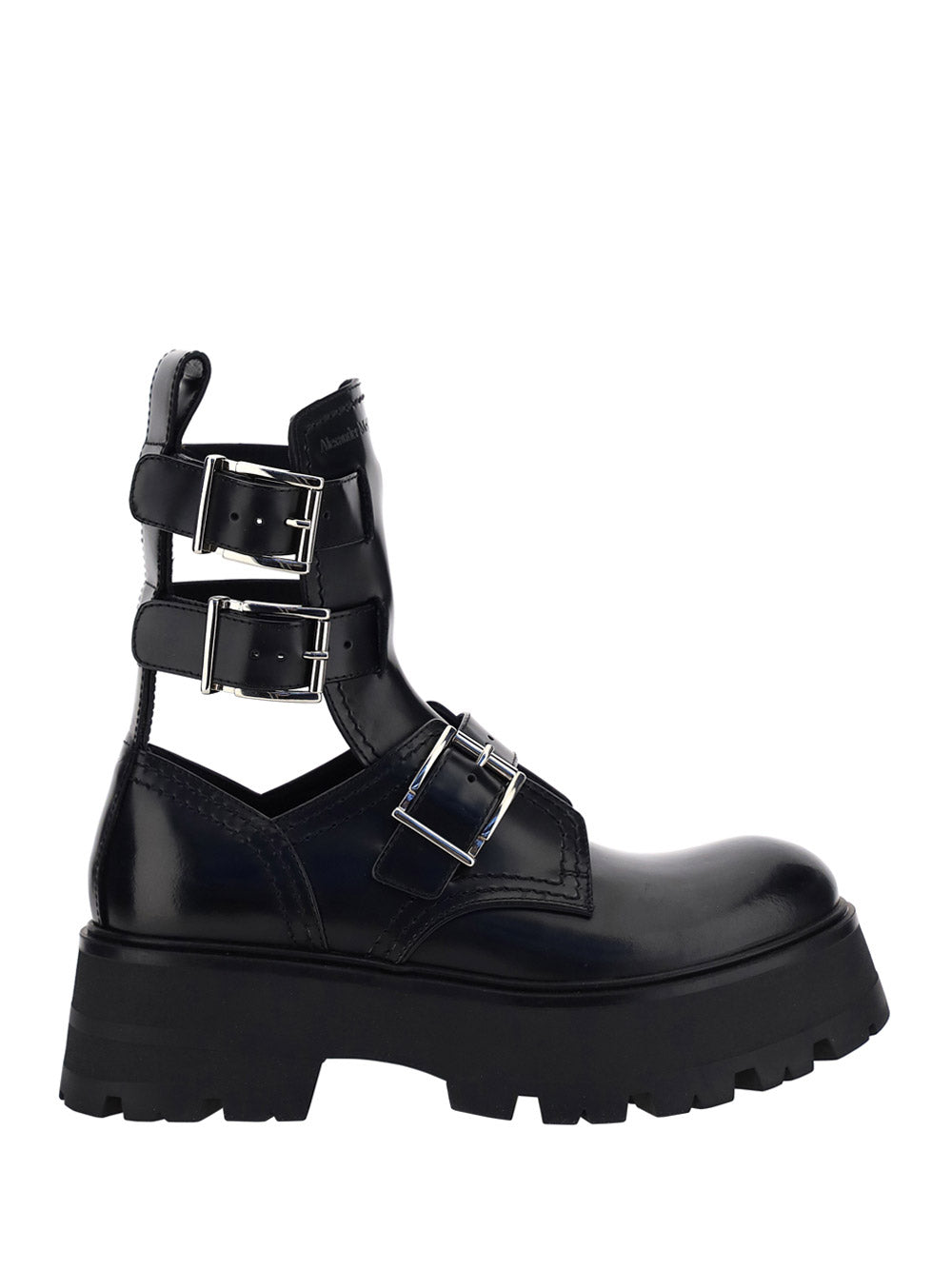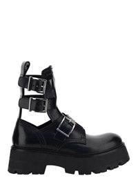 Calfskin Boots by Alexander Mc Queen, cut out design on side panels, double ankle strap, extended round toe, textured rubber sole, adjustable front buckle strap, tone on tone branded press stud on front tongue.