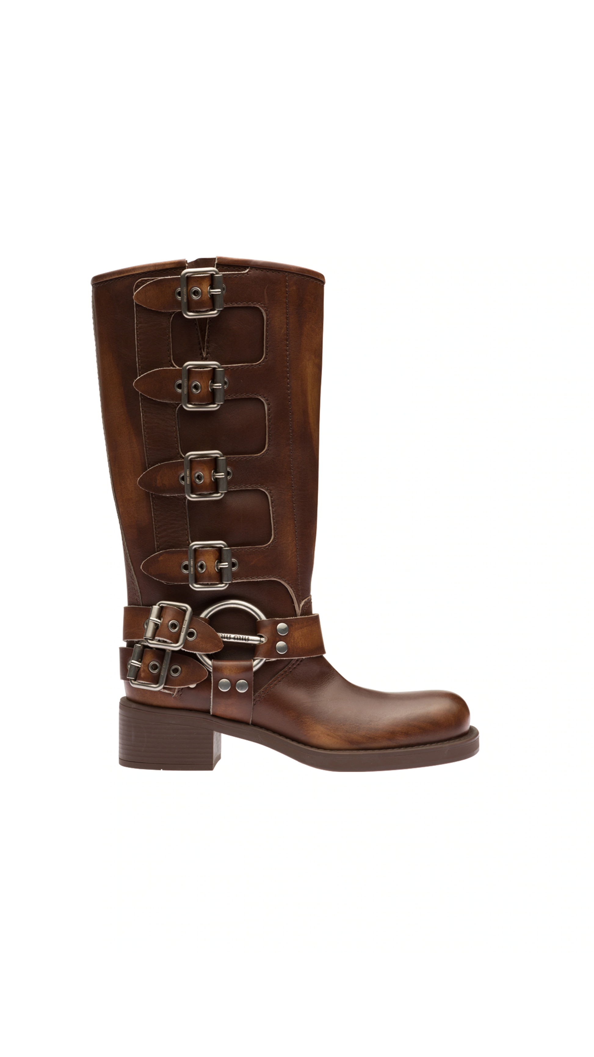 Calfskin Boots by Miu Miu, mid-length Texan model, metal inserts and buckles, round toe, slight block heel, slip-on style.