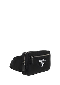 Bumbag by Prada, main compartment with zippered opening, minor front zippered compartment, brand logo plaque on the back embossed, contrasting brand logo on the front spray effect, belt with adjustable clip opening with brand logo press.