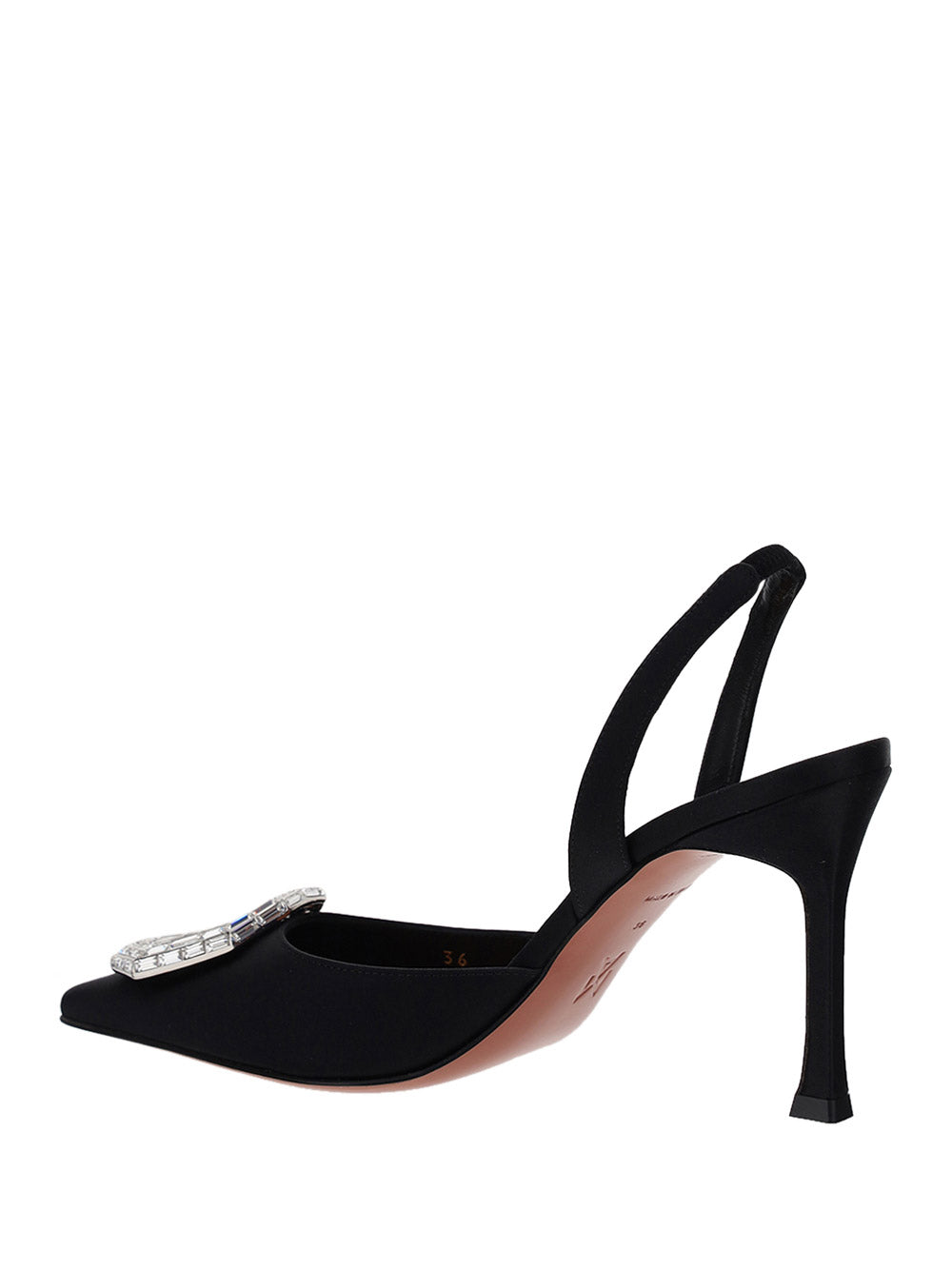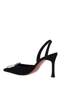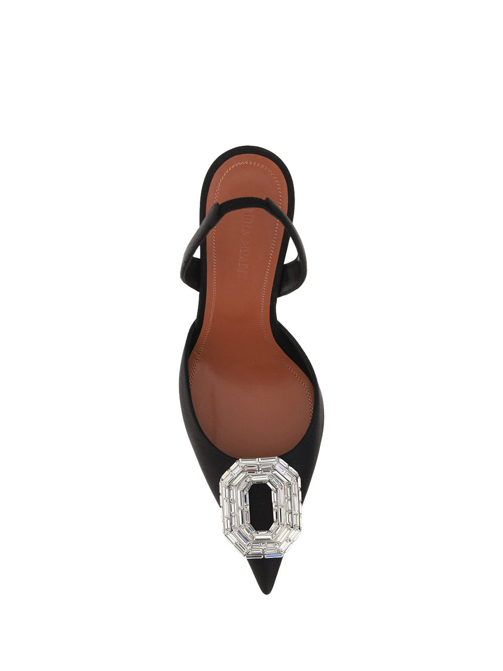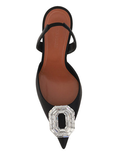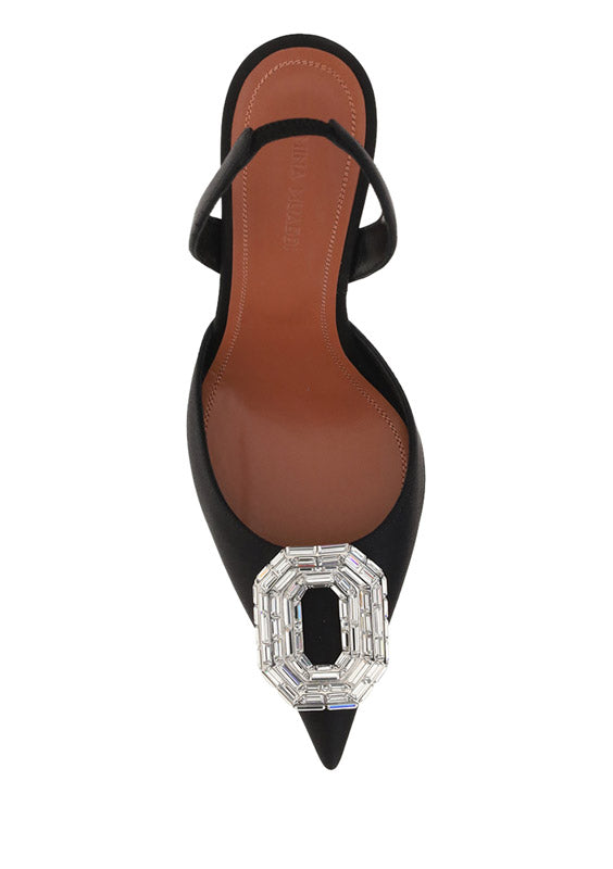 Calfskin Camelia Pumps by Amina Muaddi, sling back model, elongated toe, leather stiletto heel, jewel appliqué on front, press-on logo insole.