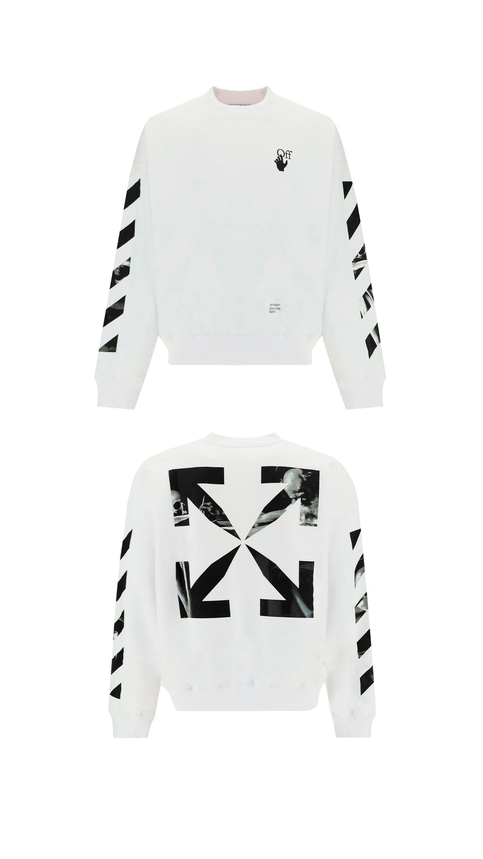 Cotton Sweatshirt by Off-White, ribbed crew neck collar, cuffs and bottom hem, contrast logo printed on front, iconic arrows printed on back.