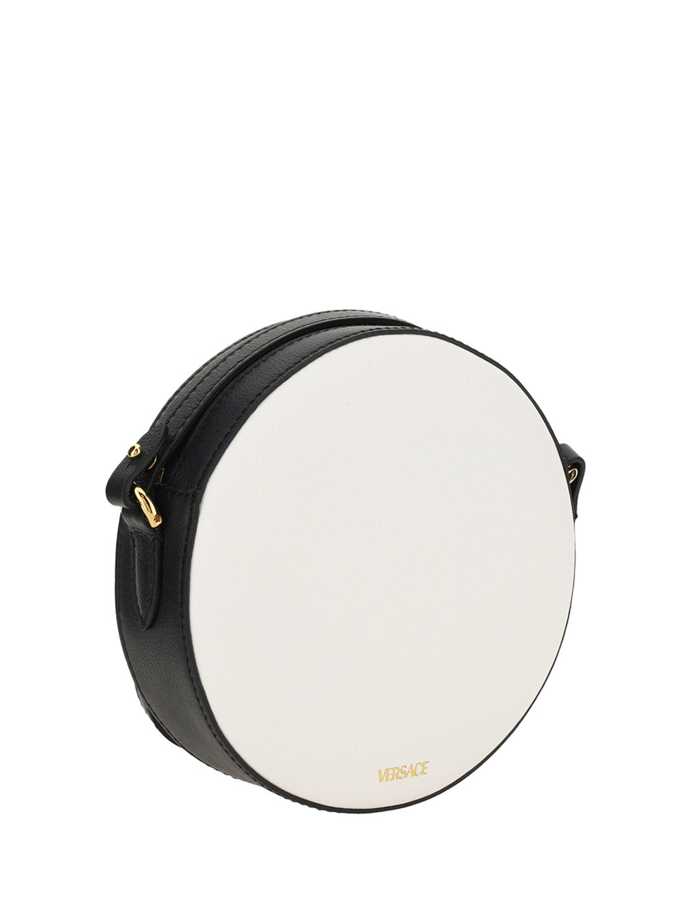 Calfskin Chain Bag by Versace, round shape, top zipper opening, removable and adjustable shoulder strap, front detail with gold plated maxi chain, iconic Medusa head embossed in the center, inside welt pocket.