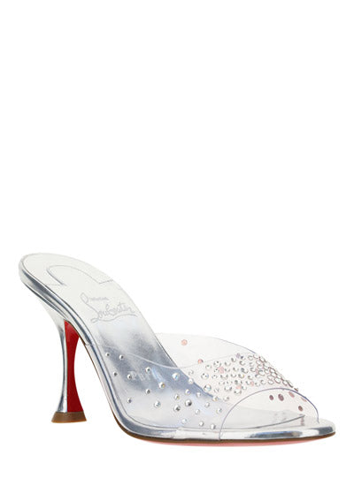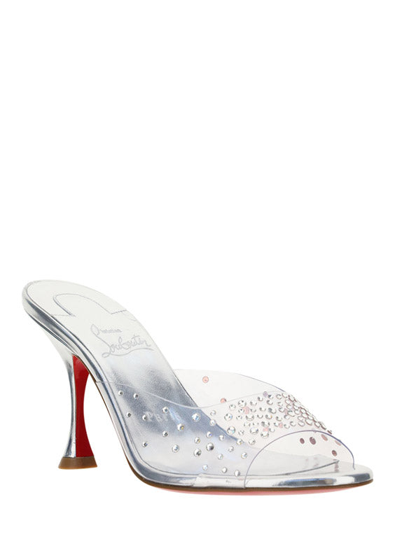 Degramule Strass Sandals by Christian Louboutin, mirrored stiletto heel, transparent front band, embossed glitter and rhinestones on the front band, open toe.