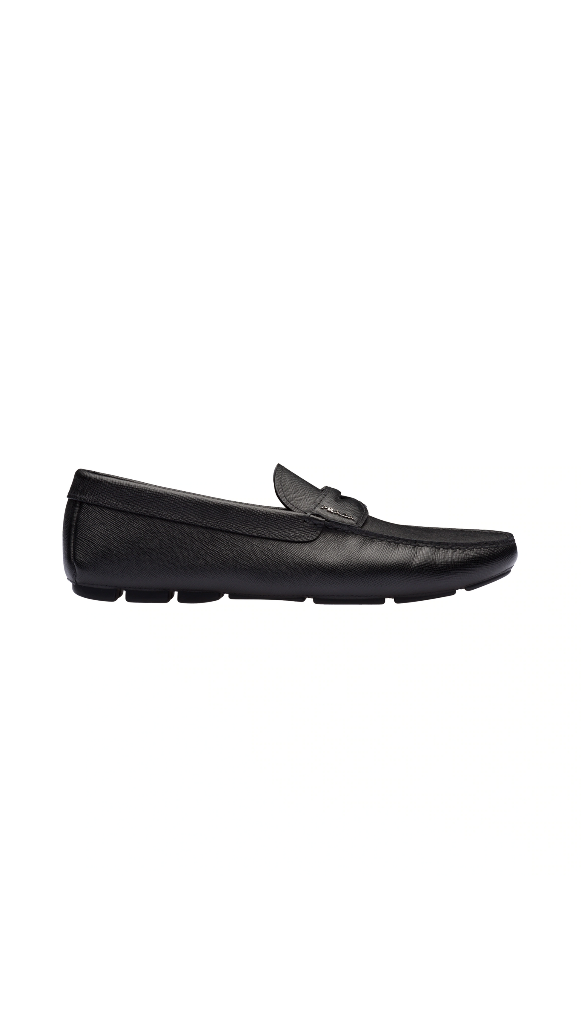 Men's Black Saffiano Leather Drive Loafers by Prada, classic design with a metallic logo plague on front, logo at sole and insole.