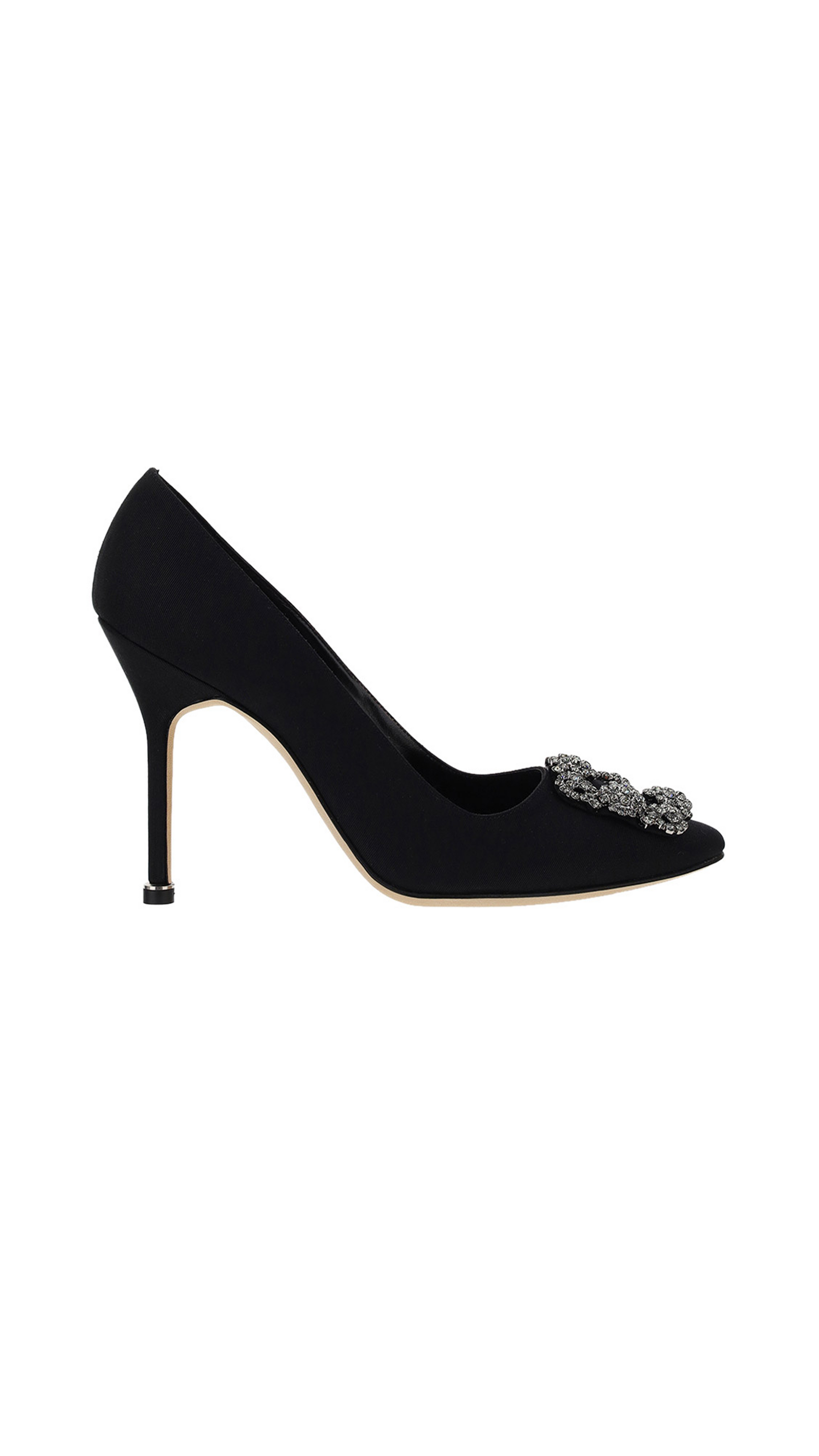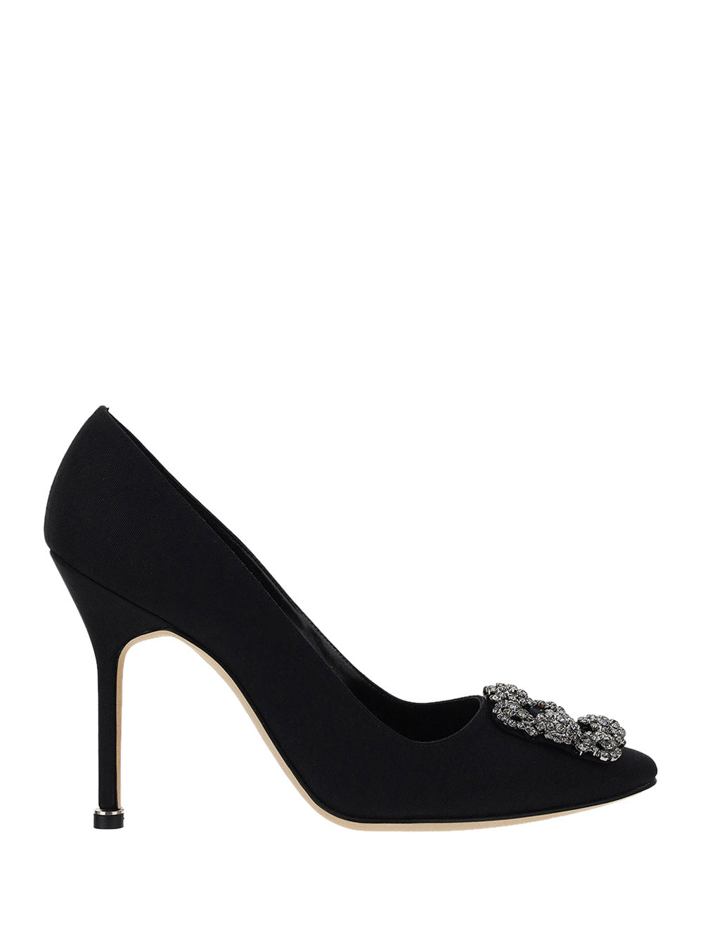 Gros Grain Hangisi Pumps by Manolo Blahnik, almond toe, iconic jeweled buckle appliqué on front, leather stiletto heel, logoed insole.