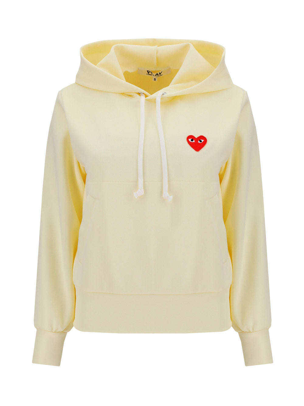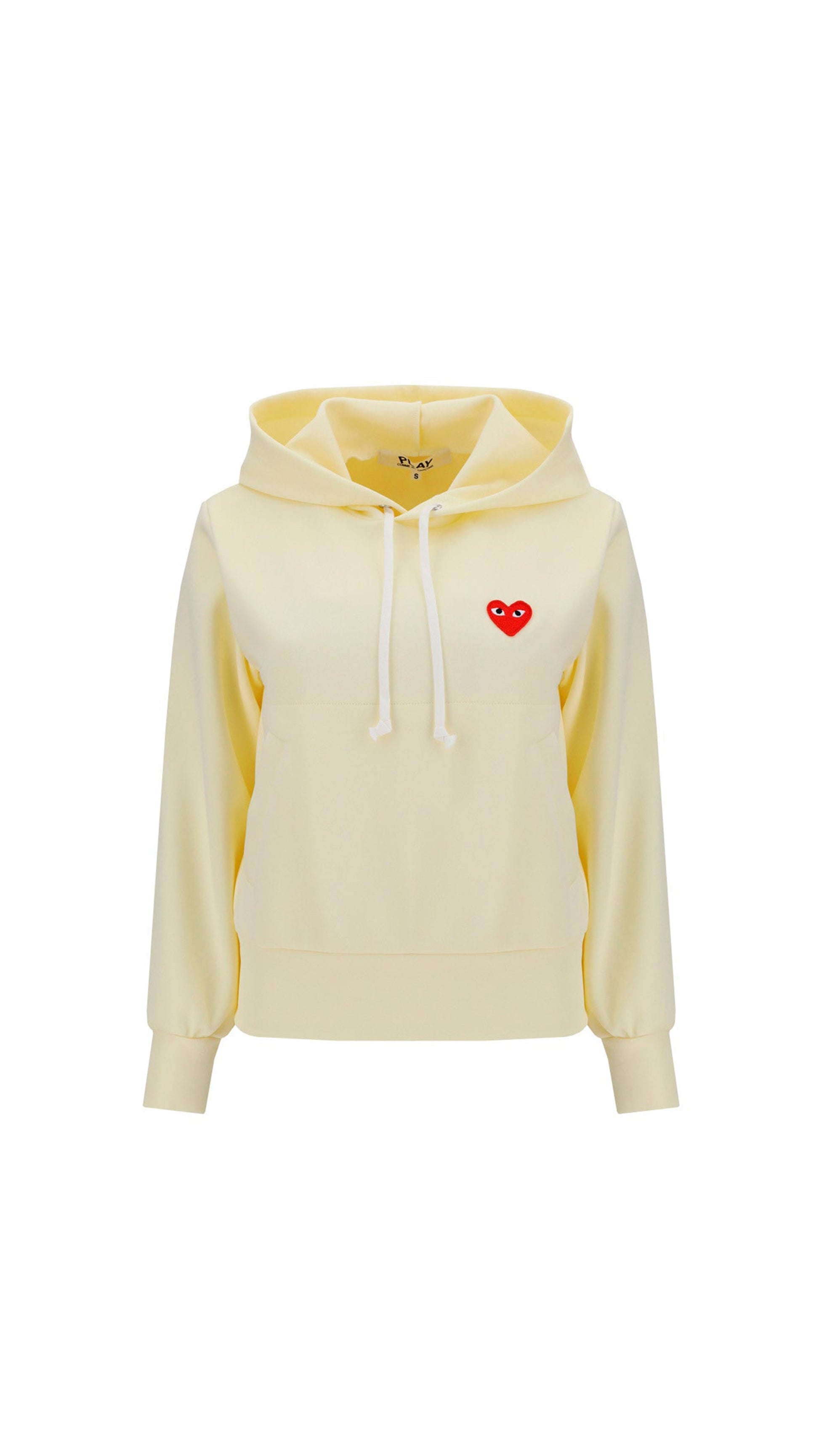 Woman Pullover Hoodie by Comme des Gaconds Play, with heart motf, drawstring hood, long sleeves, front pouch pocket, straight hem.