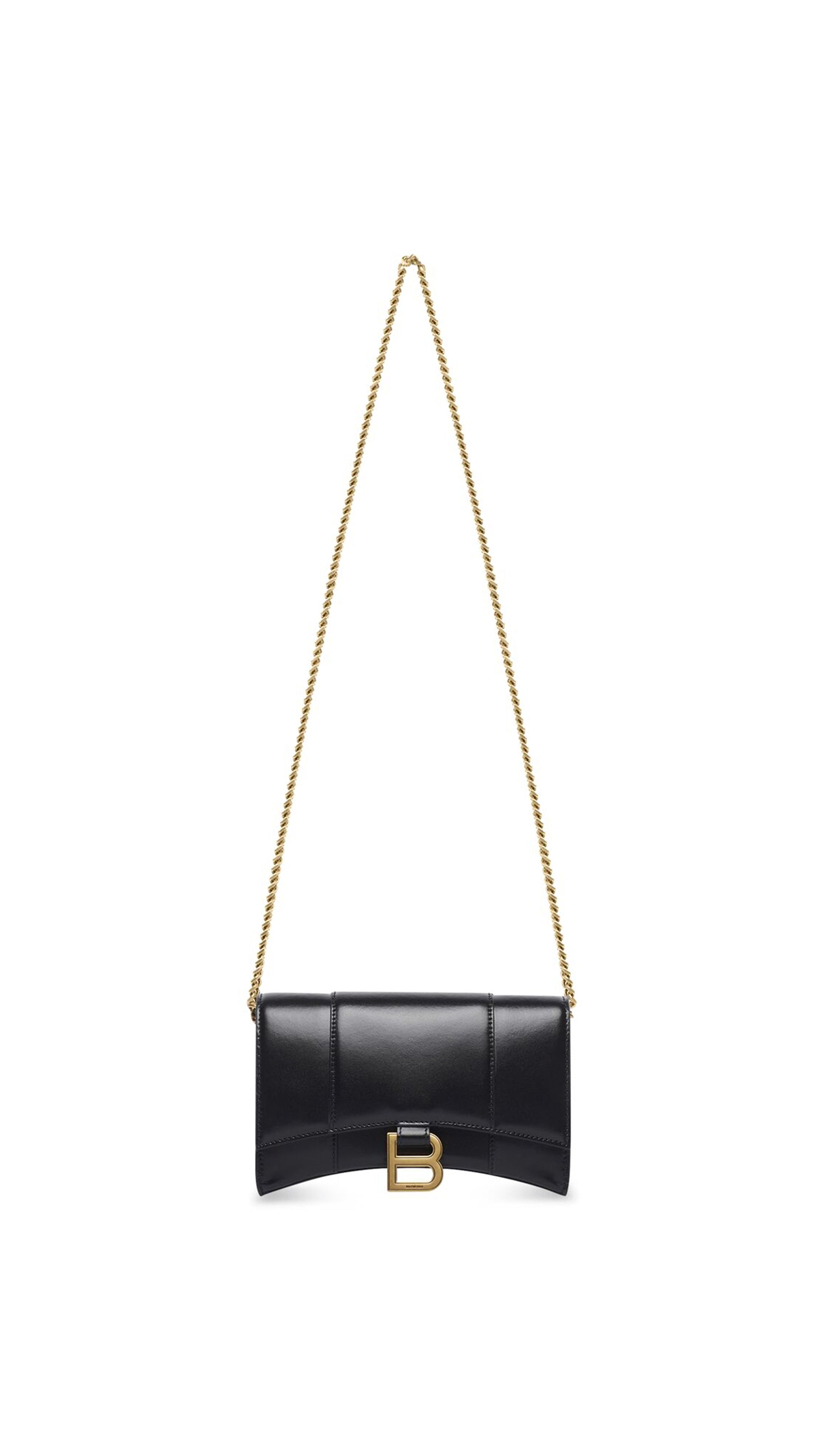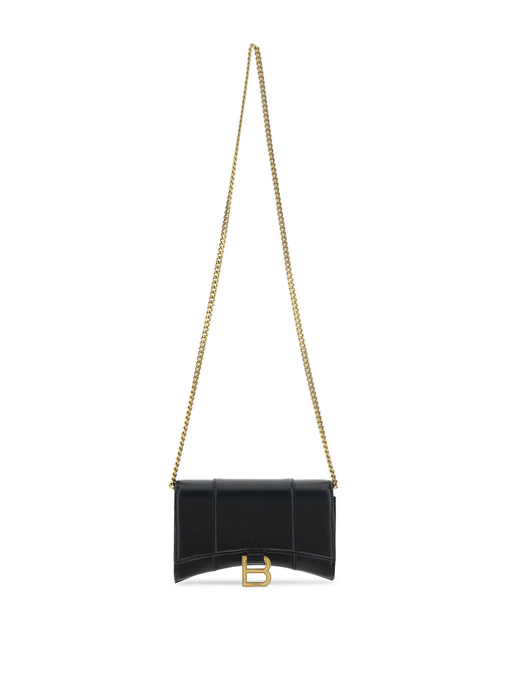 Calfskin Hourglass Chain Wallet by Balenciaga, magnetic button flap closure, mongoram logo plaque on front, removable chain shoulder strap, internal card slots, bill compartments with zip pocket.