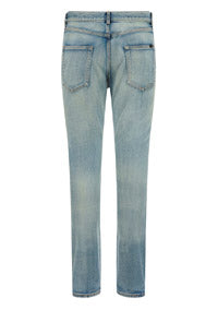 Men's cotton Jeans by Saint Laurent, five-pocket straight style, front zipper and button closure, waist belt loops, brand signature embossed on buttons, frayed design, mini leather patch with iconic brand monogram printed press-stamped applique on back.