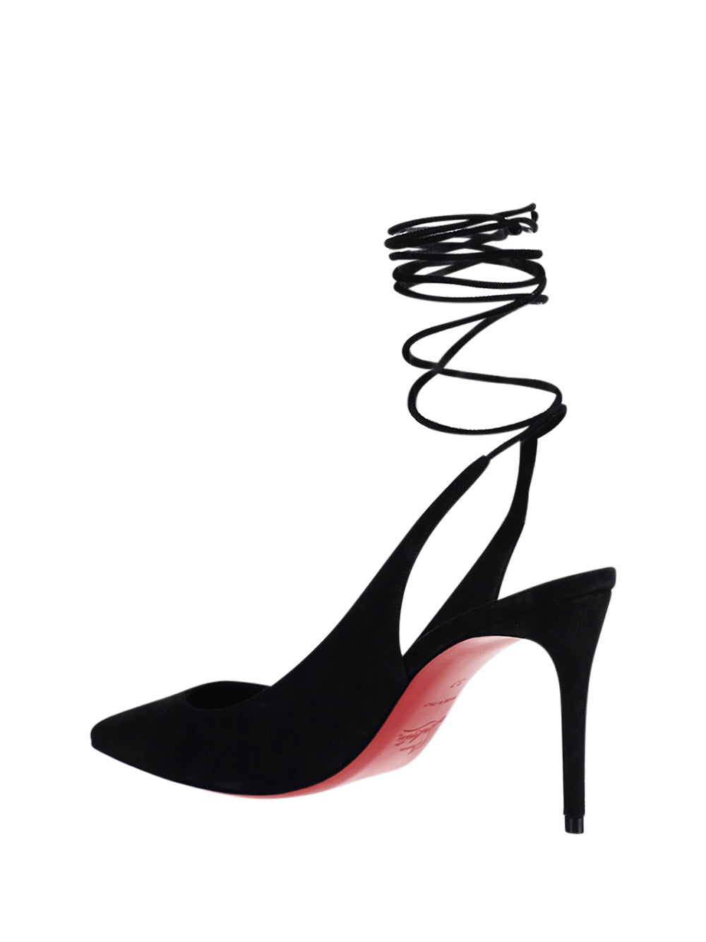 Calfskin Kate Braided Sandals by Christian Louboutin, stiletto heel, elongated toe, suede leather design, braided lace-up ankle closure, sole with iconic brand color, logo-embossed insole.