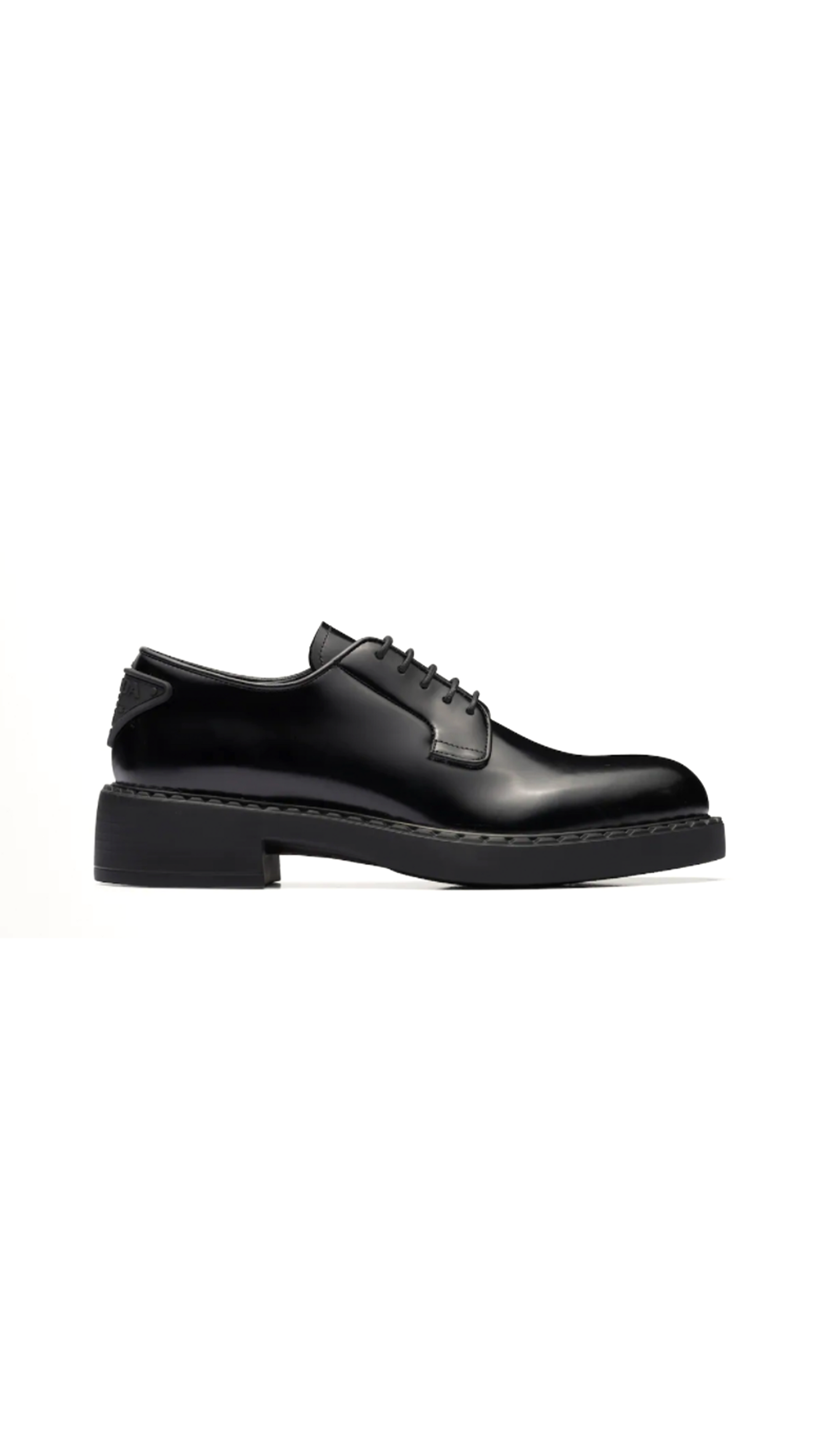 Calfskin Lace-up Shoes by Prada, round toe, slight heel, front closure with laces, logoed insole, iconic triangle signature brand applied in relief on the heel tone on tone.