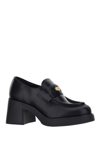 Calfskin Loafers by Miu Miu, block heel, slip-on style, brand's iconic coin logo applied in contrast on front tray, round toe, tone-on-tone trim.