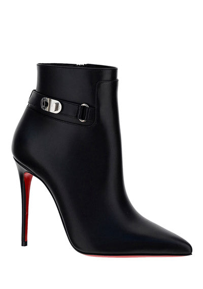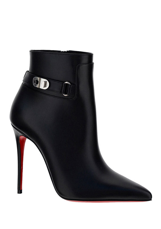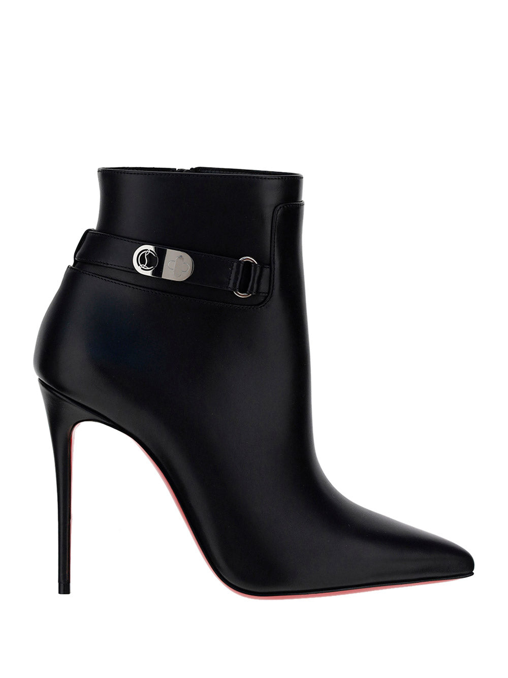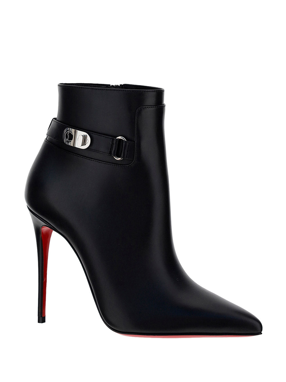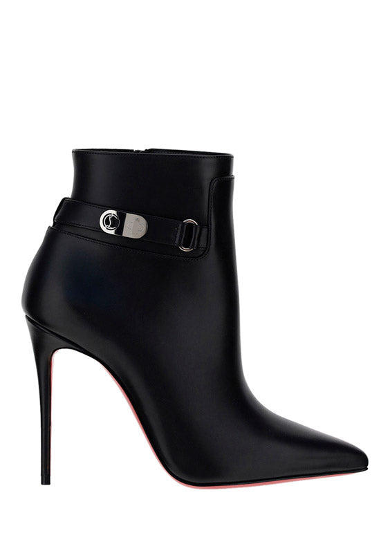 Calfskin Lock So Kate Boots by Christian Louboutin, elongated toe, leather stiletto heel, side zipper closure, sole with iconic brand color, leather ankle lap band with contrasting applied padlock