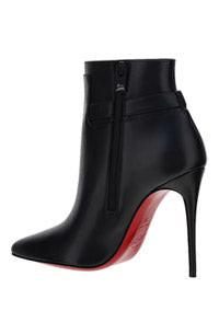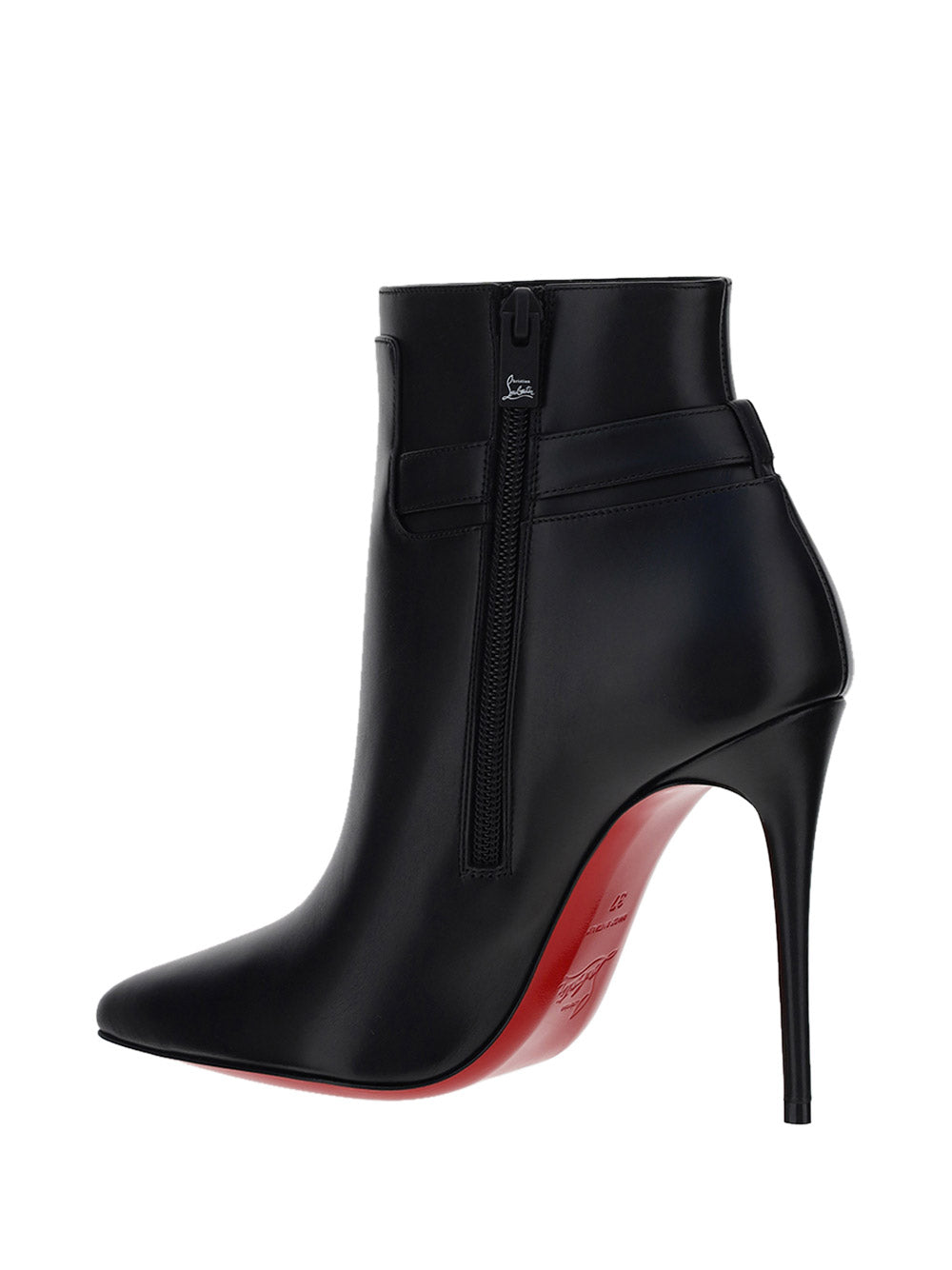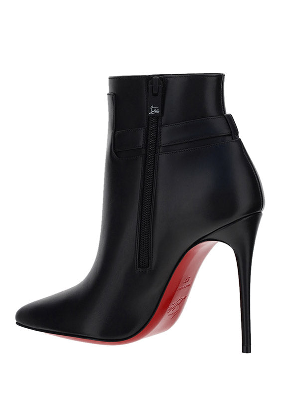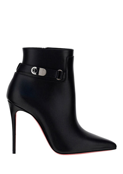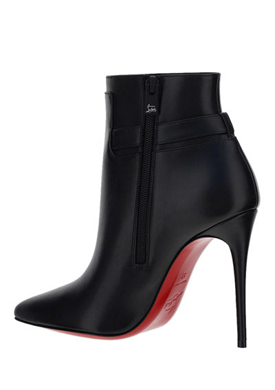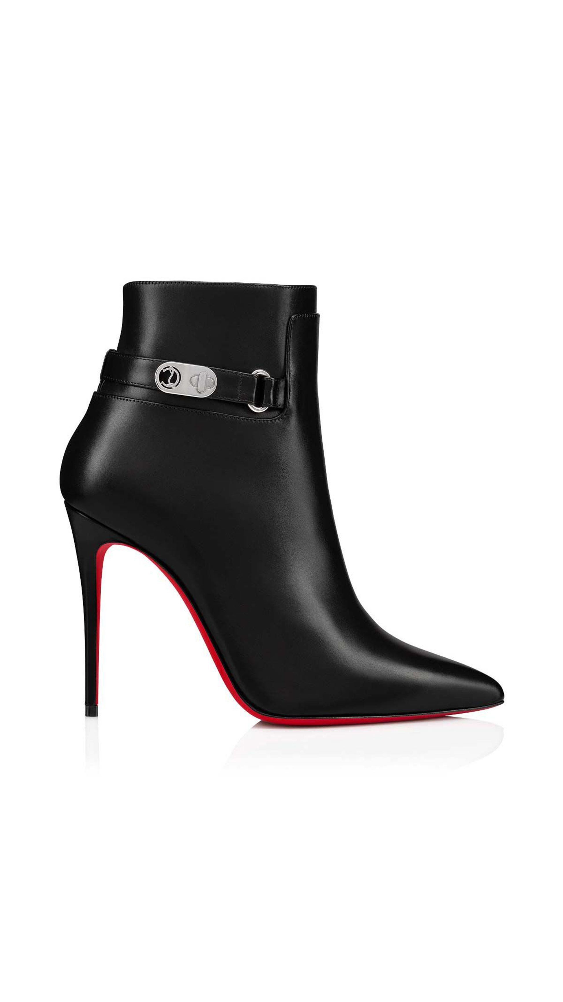 Calfskin Lock So Kate Boots by Christian Louboutin, elongated toe, leather stiletto heel, side zipper closure, sole with iconic brand color, leather ankle lap band with contrasting applied padlock