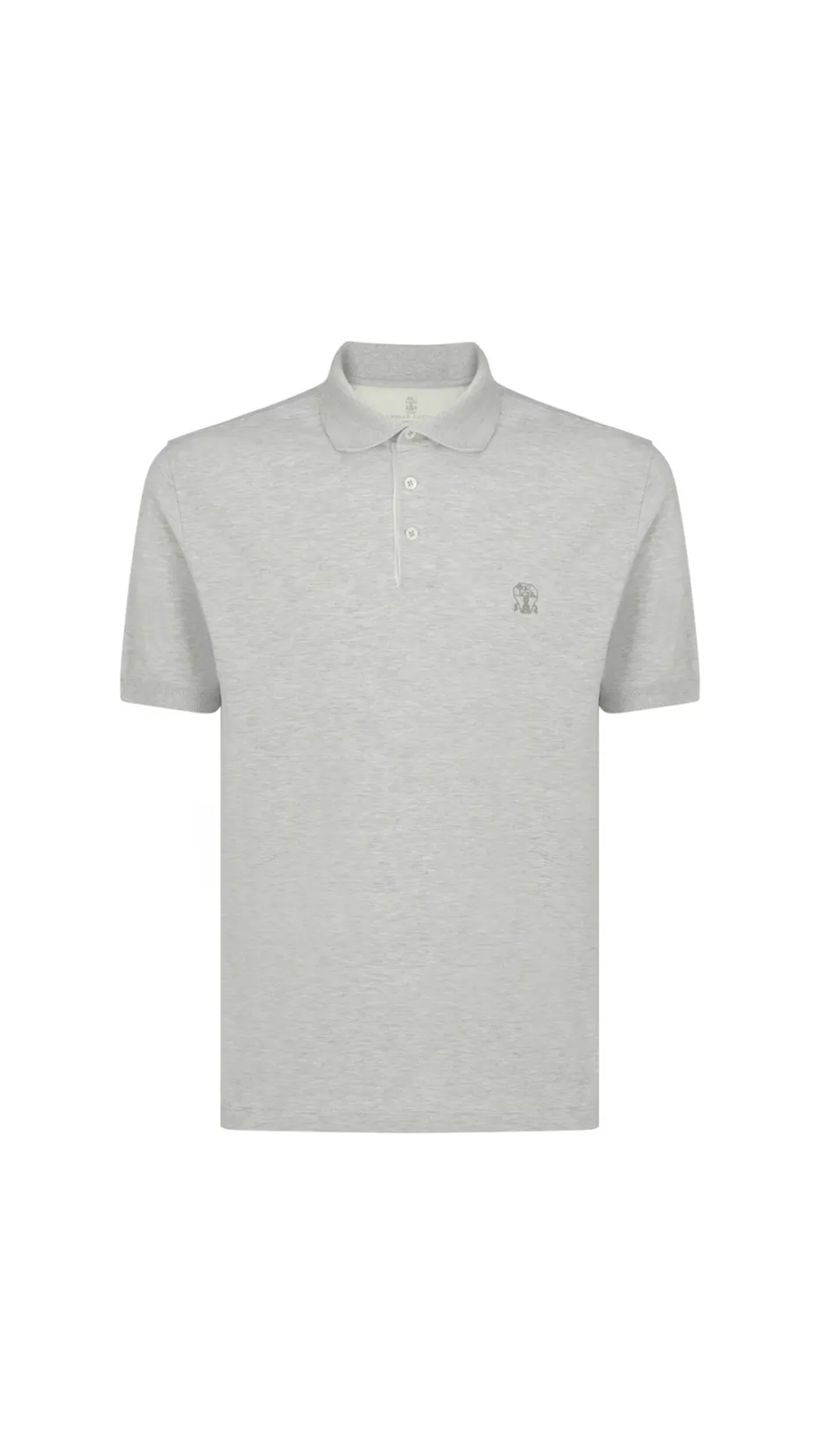 Cotton Polo Shirt by Brunello Cucinelli, classic ribbed collar, contrasting button front closure, iconic brand logo print detail applied to front, ribbed sleeve hem, mini side slits.