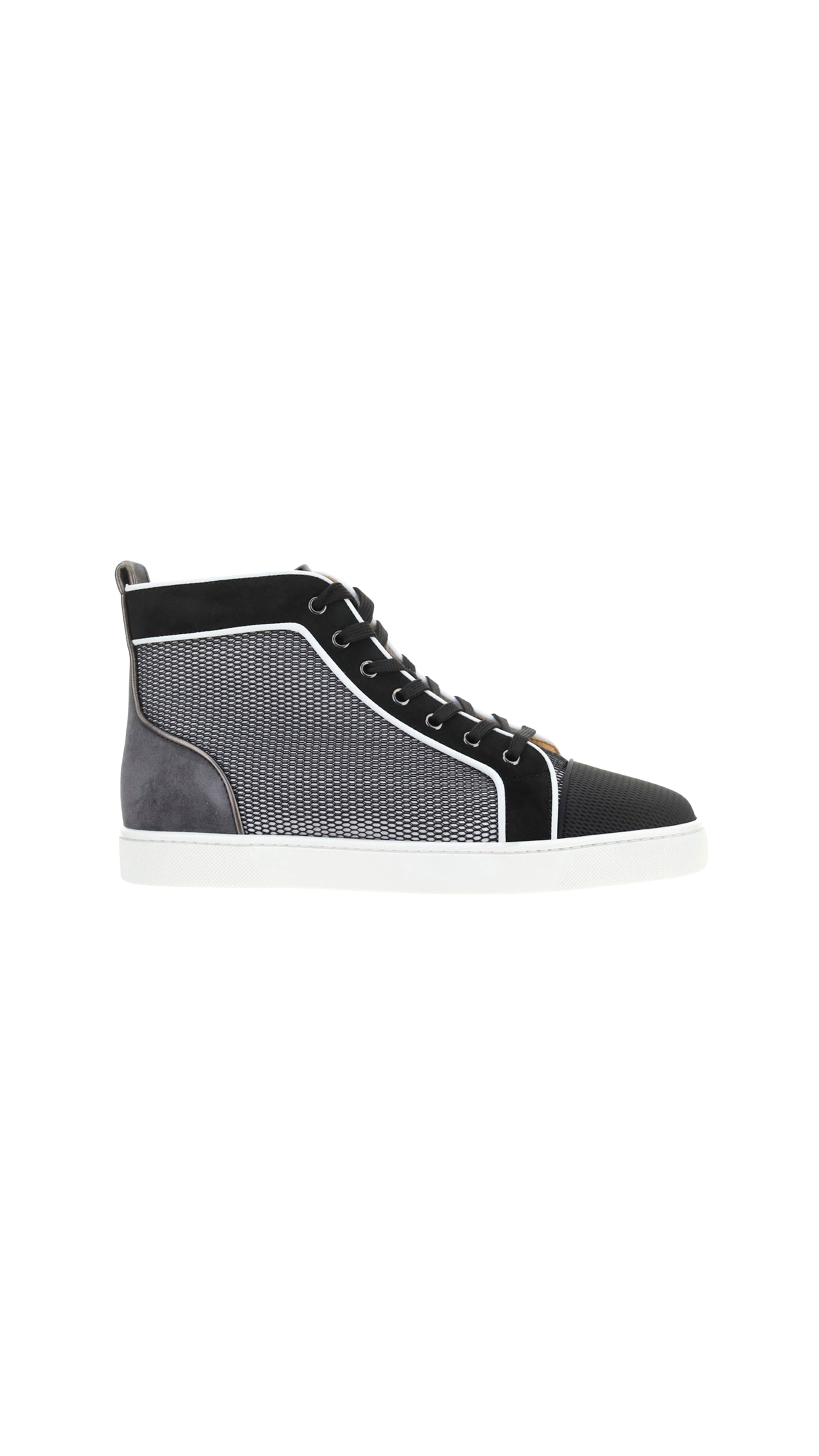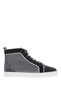 Leather Louis Orlato Sneakers by Christian Louboutin, lace-up front closure, round toe, iconic brand logo on side panel, suede heel detail, ankle-length pattern.