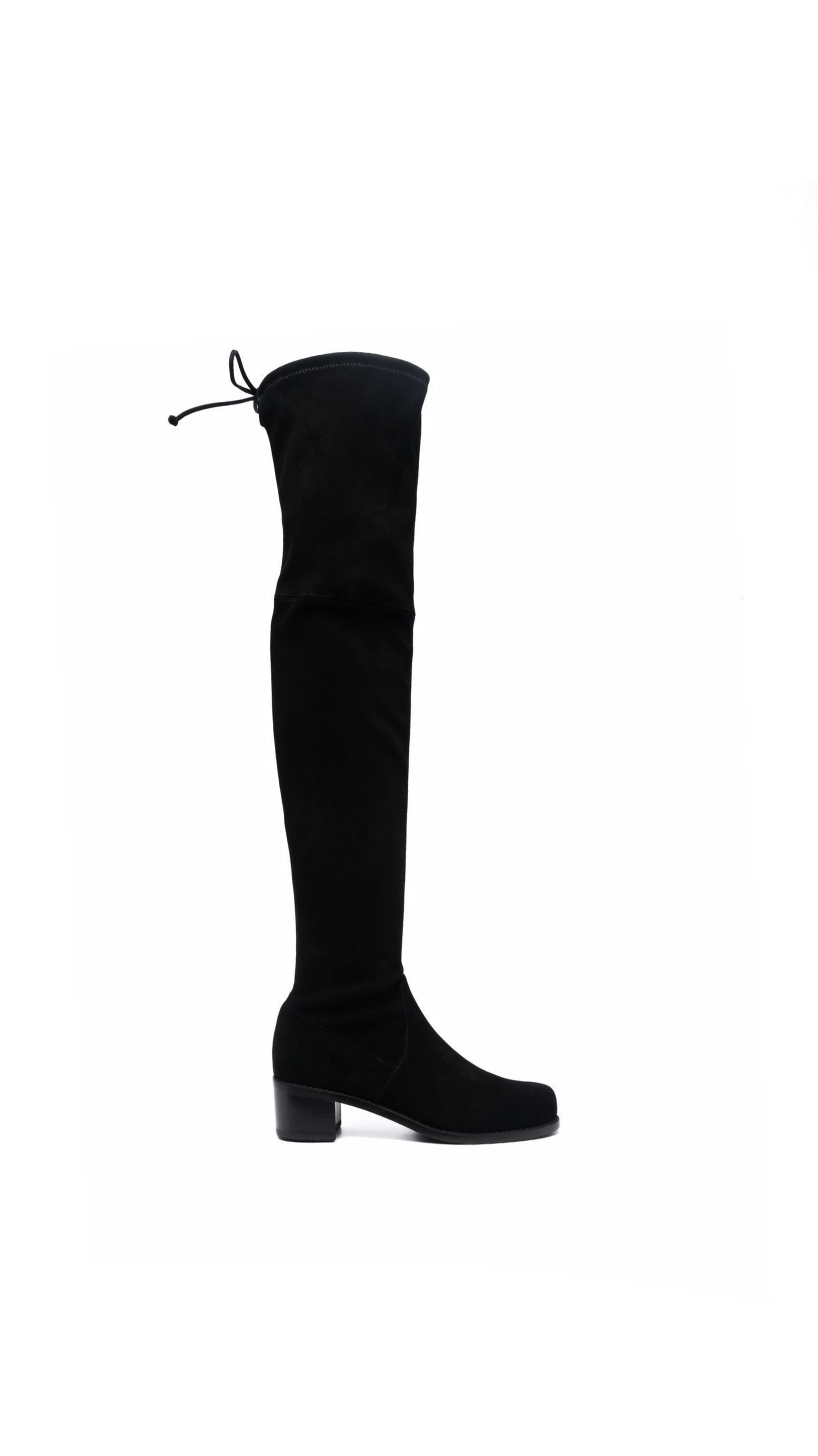 Suede Lowland Boots by Stuart Weitzman, featuring an extended toe, an adjustable lace-up back, an over-the-knee high model.