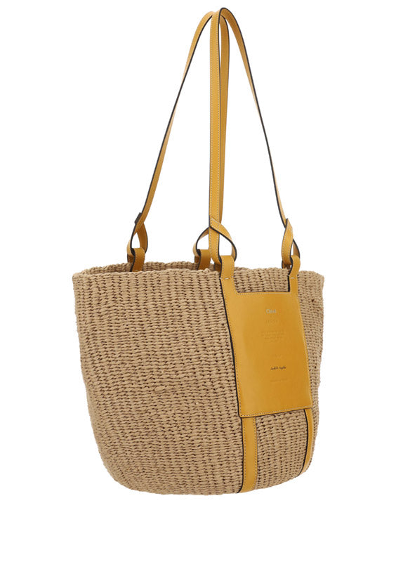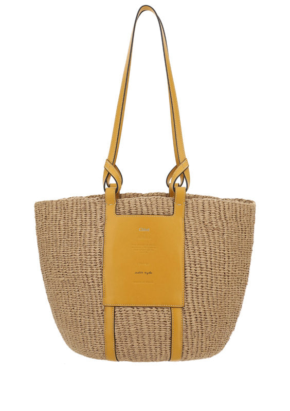 Mifuko Bag by Chloé, tote model, long leather handles, leather front pocket with iconic press-stamped brand logo, all-over woven design, leather brand logo tag applied inside.