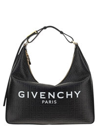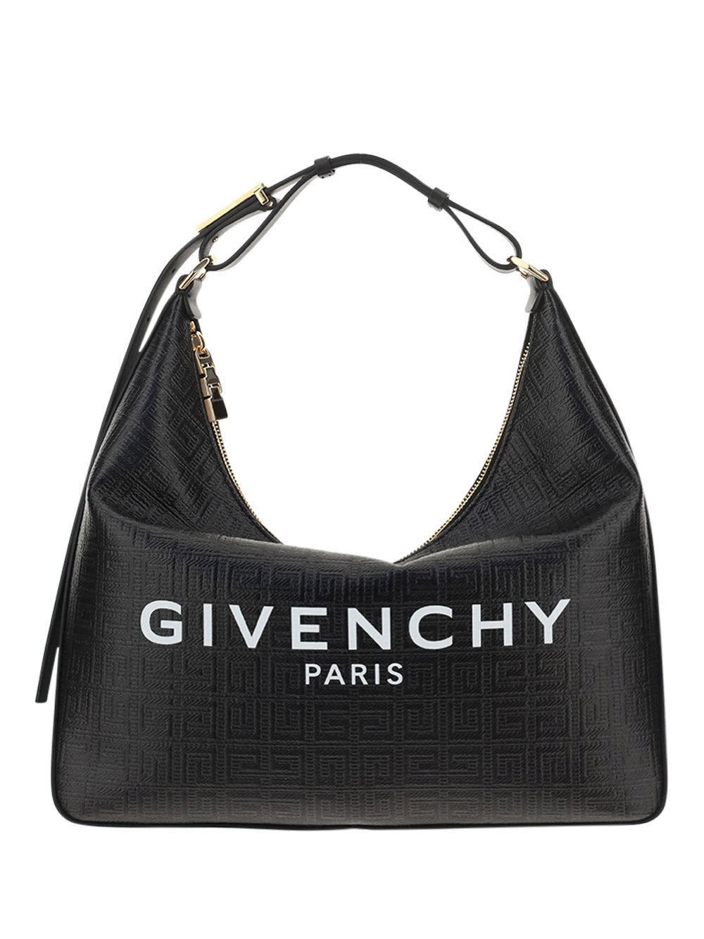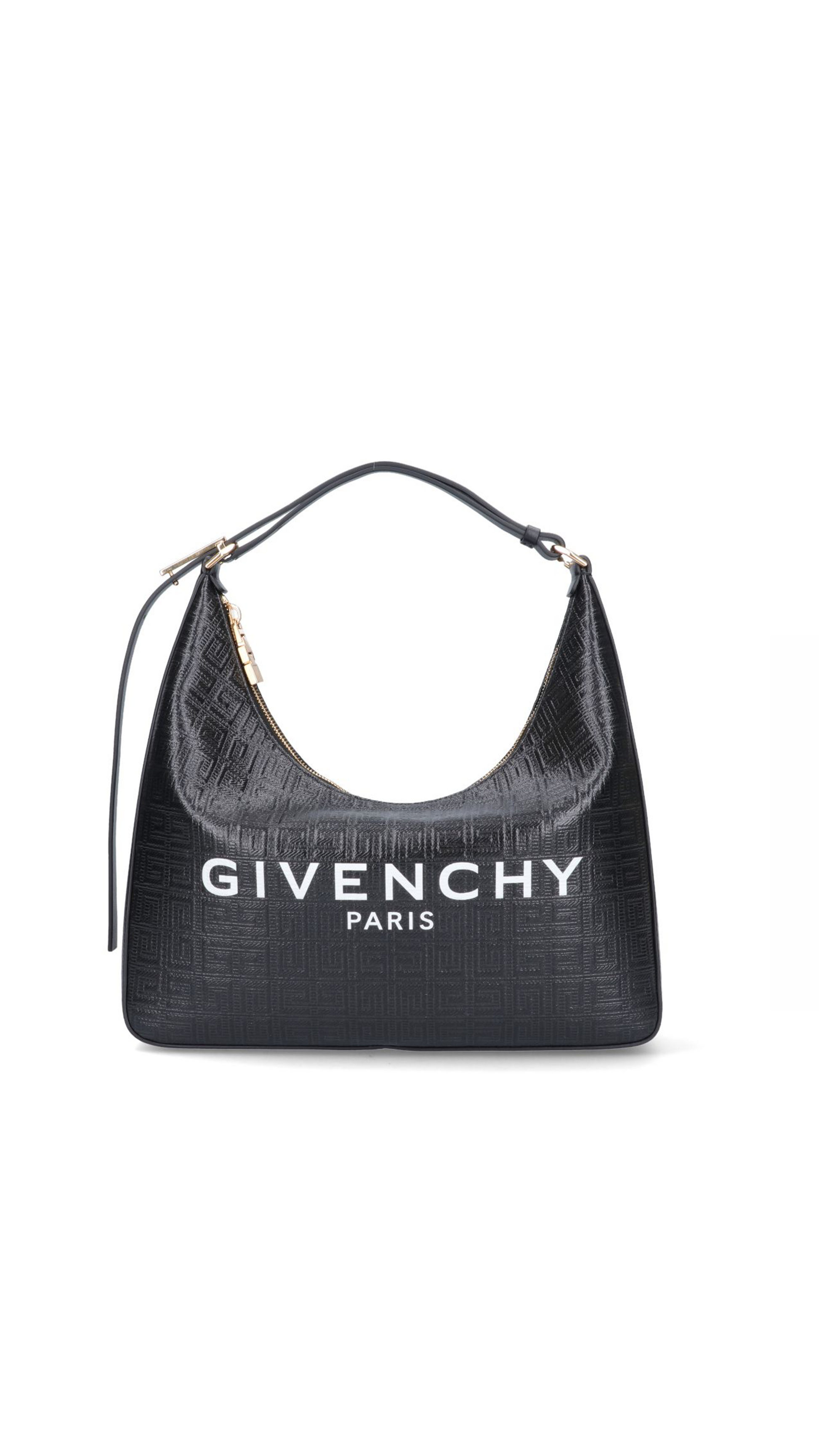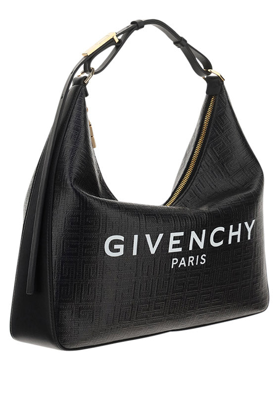 Moon Cut Out Bag by Givenchy, zippered top closure, adjustable shoulder strap, iconic all-over tone-on-tone printed brand monogram, iconic contrasting brand signature on front, puller with iconic 4G pattern, interior welt pocket.