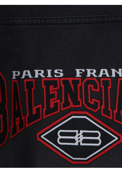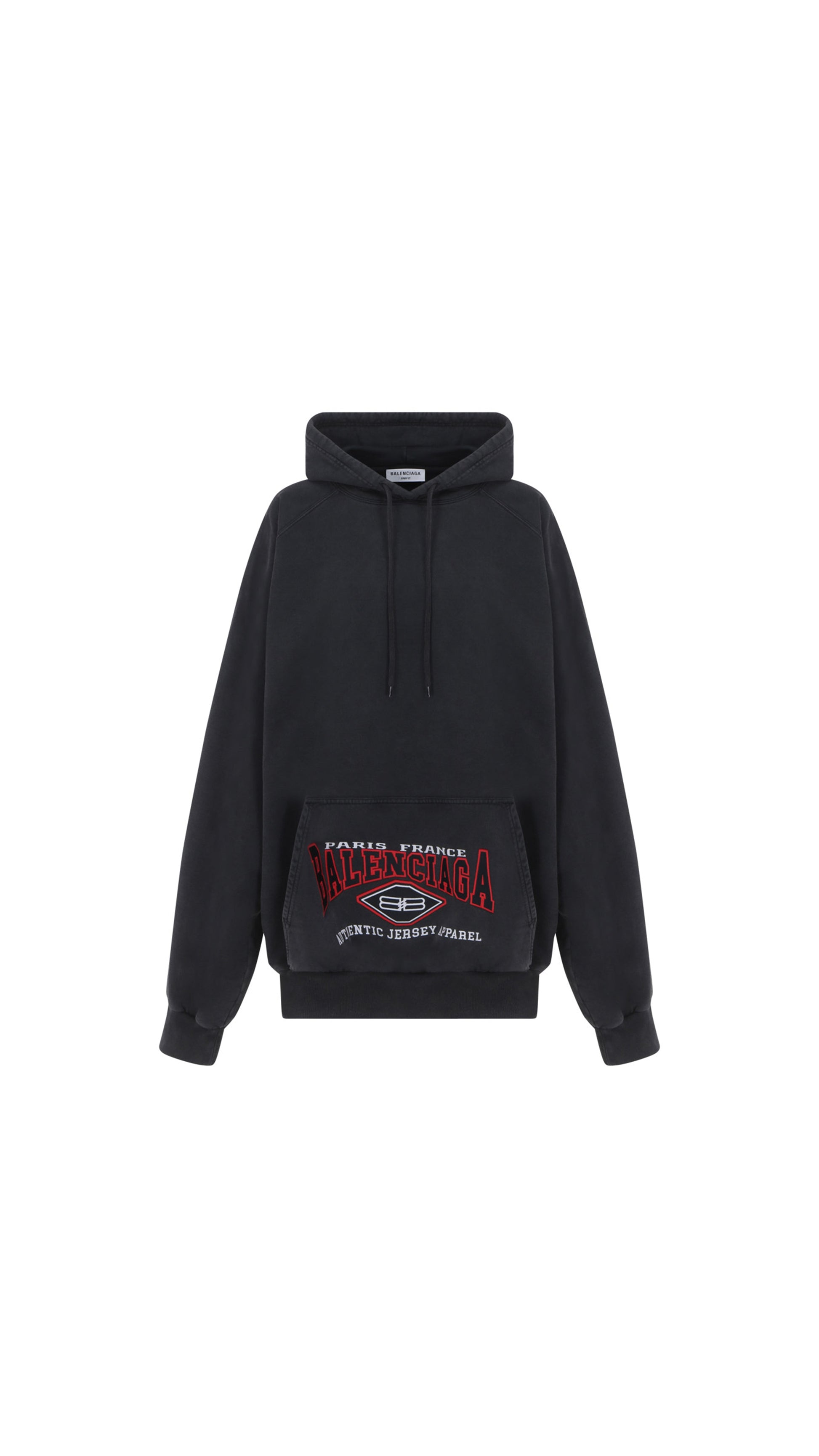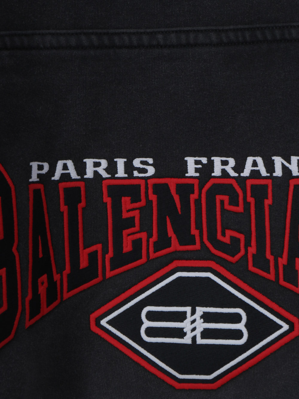 Cotton Oversize Hoodie by Balenciaga, drawstring hood, kangaroo pocket at front, contrasting printed brand signature at pocket, ribbed cuffs, ribbed hem.