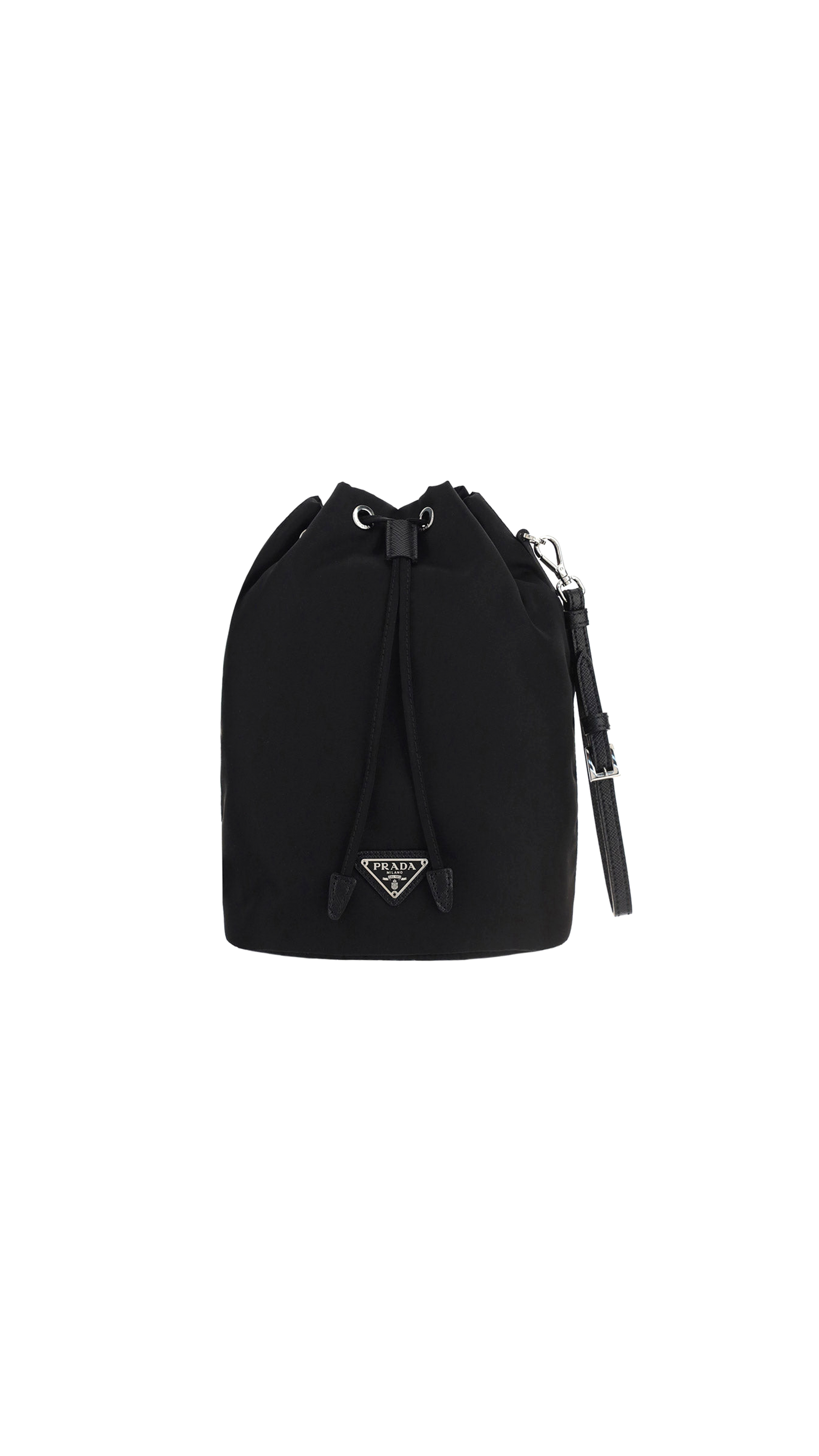 Nylon Pouch by Prada, featuring adjustable drawstring closure, iconic triangular logo plaque at front, removable wrist strap, internal compartment.