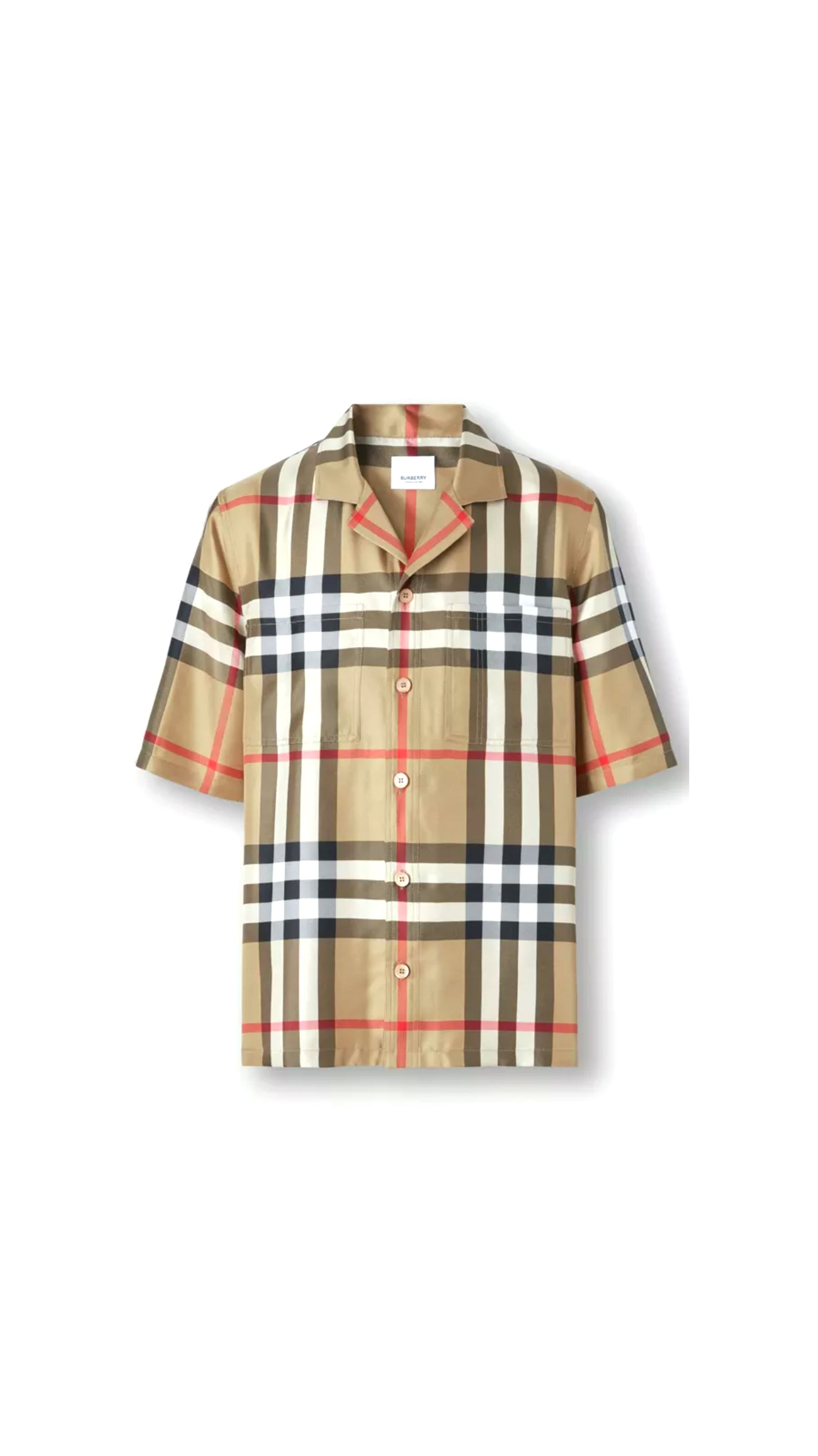 Silk Reepham Shirt by Burberry, front button closure, classic collar, two patch pockets on the front, design with iconic all-over repeated brand pattern.