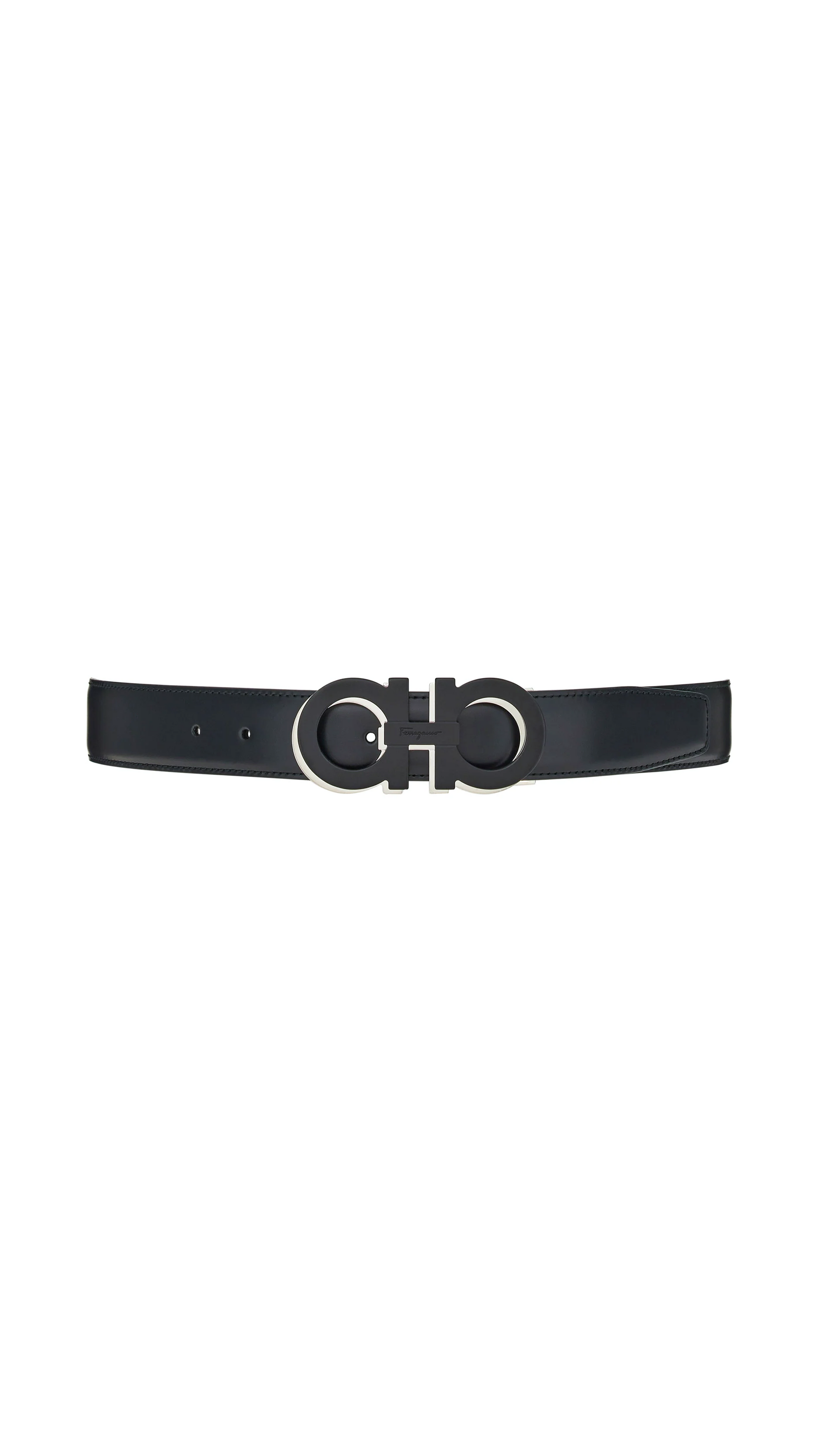 Calfskin Reversible Belt by Salvatore Ferragamo, double face design, one side smooth leather, one side grained leather, front buckle with iconic brand logo. Thickness: 3 cm.
