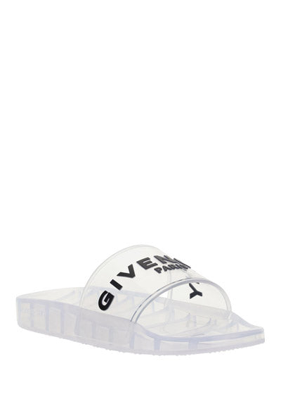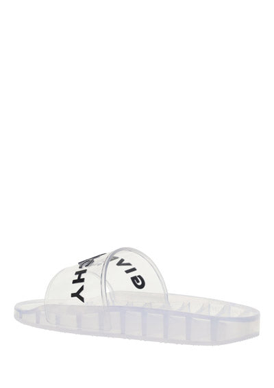 Woman's Sandals by Givenchy, slip-on style, contrast embossed brand logo on front, round toe, flat sole, semi-transparent pattern.