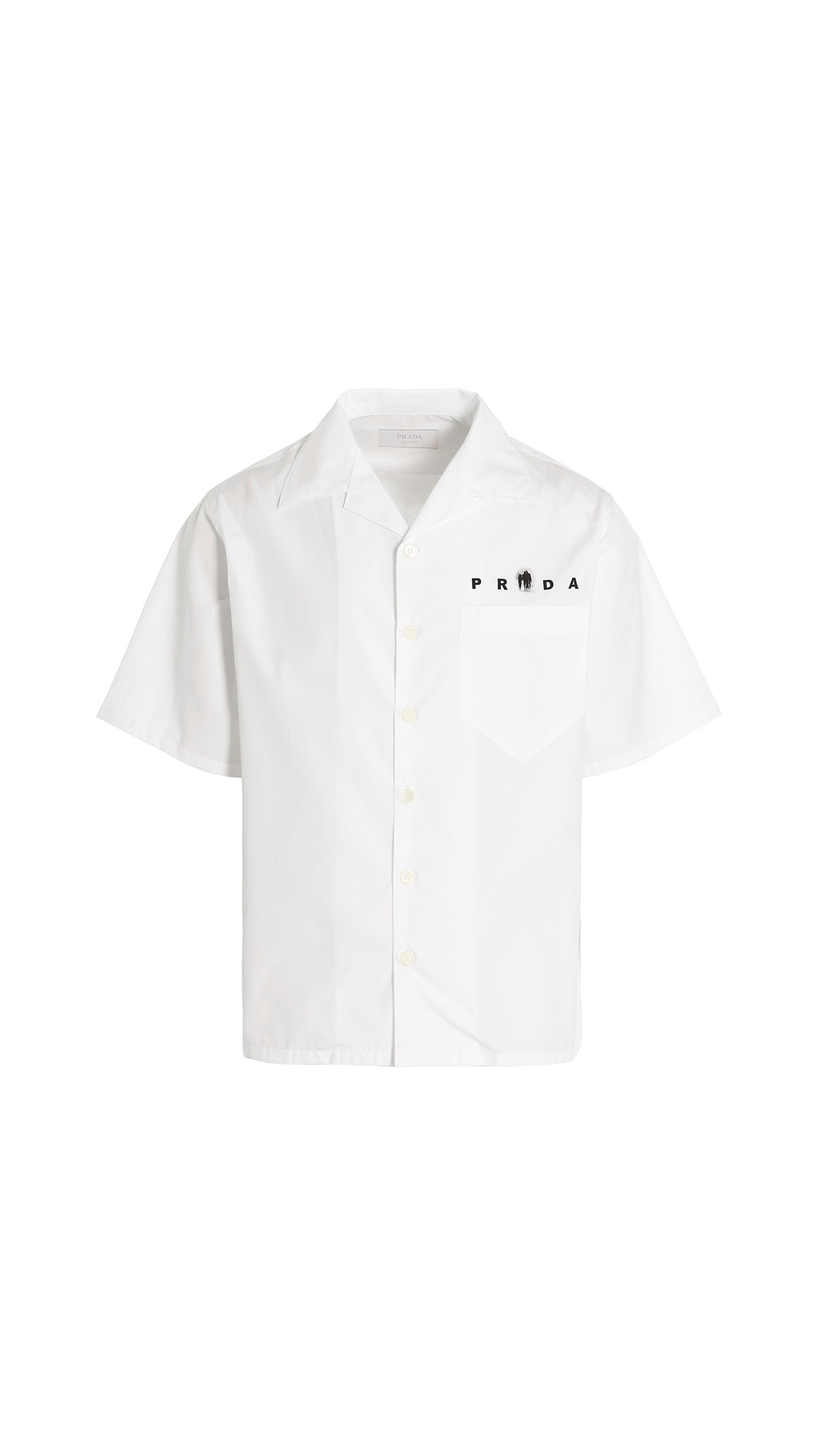 Men's Cotton Shirt by Prada, bowling style with short sleeves, classic collar, front button closure, patch pocket suk front, iconic brand signature contrasting front, contrasting maxi print on back, iconic embroidered brand triangle embossed on back below collar, regular fit.