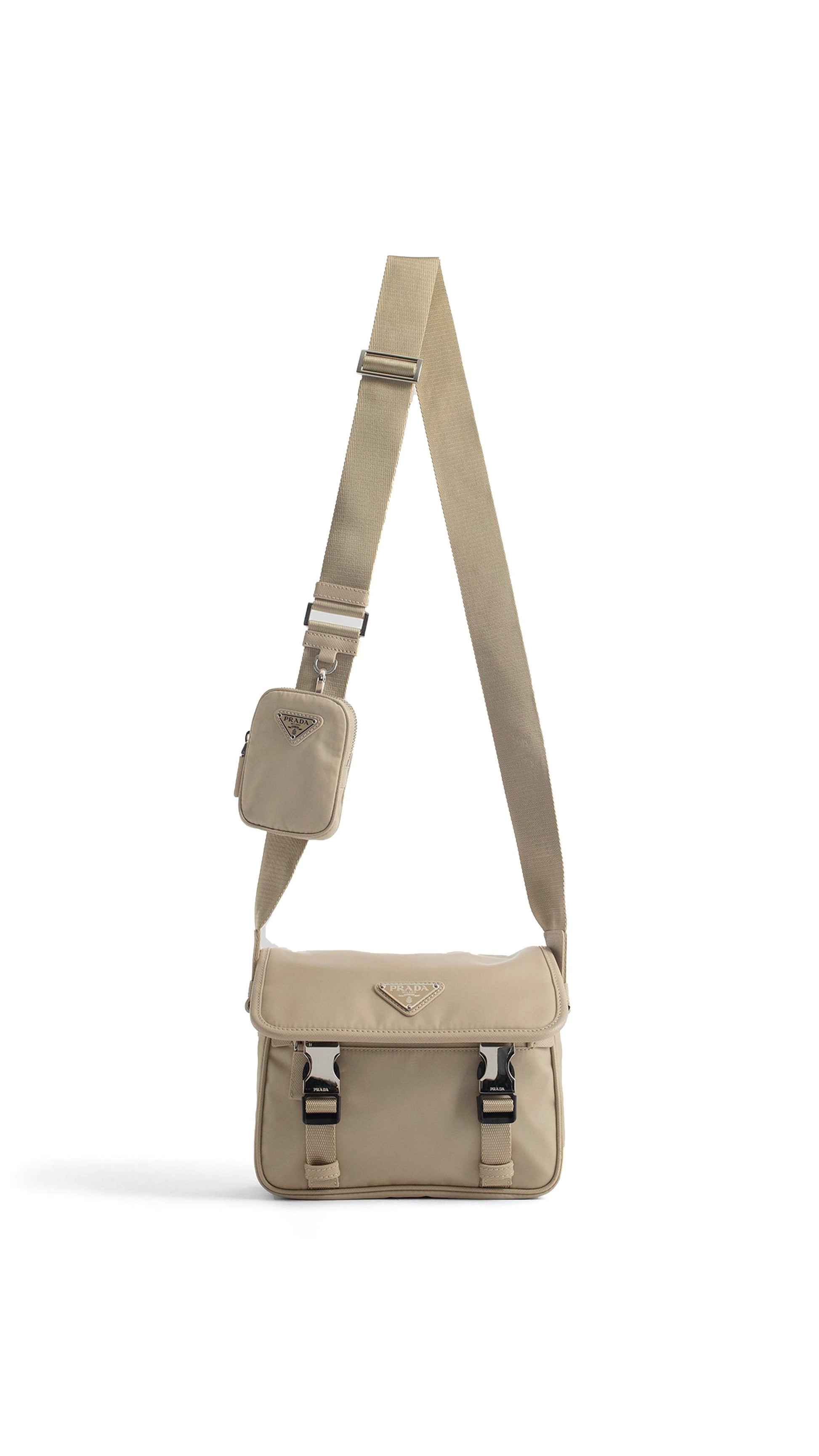 Shoulder Bag by Prada, opening with contrasting double clip on the front, brand logo plaque applied on the front, adjustable shoulder strap, small pouch applied with hook on shoulder strap, front welt pocket with zipper, double internal compartment.