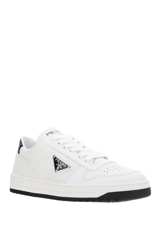 Woman Sneakers by Prada, Triangular contrasting logo on the side, round toe, front lacing, contrasting logo on the back and on the front tab.