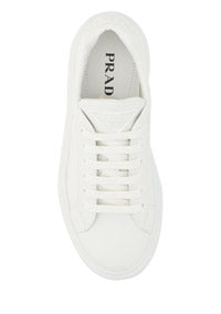 Leather Sneakers by Prada, featuring a round toe, a lace-up fastening, a platform sole, a contrasting logo detail at the back.