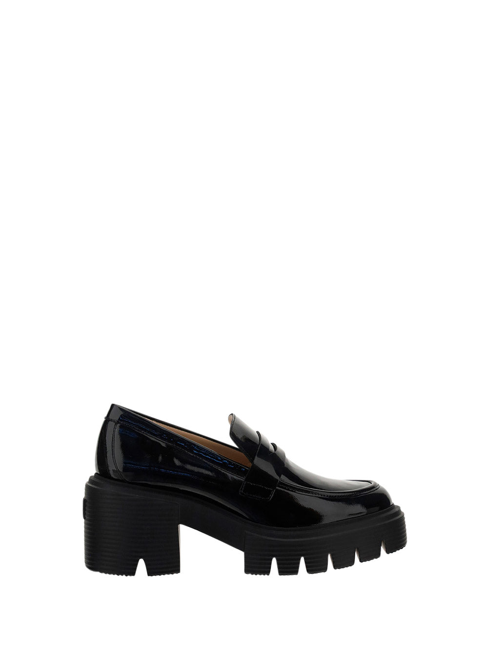 Calfskin Soho Loafers by Stuart Weitzman, textured sole with chunky heel, slip-on style, press-on logo insole, shiny leather effect.