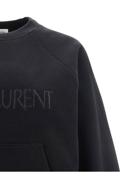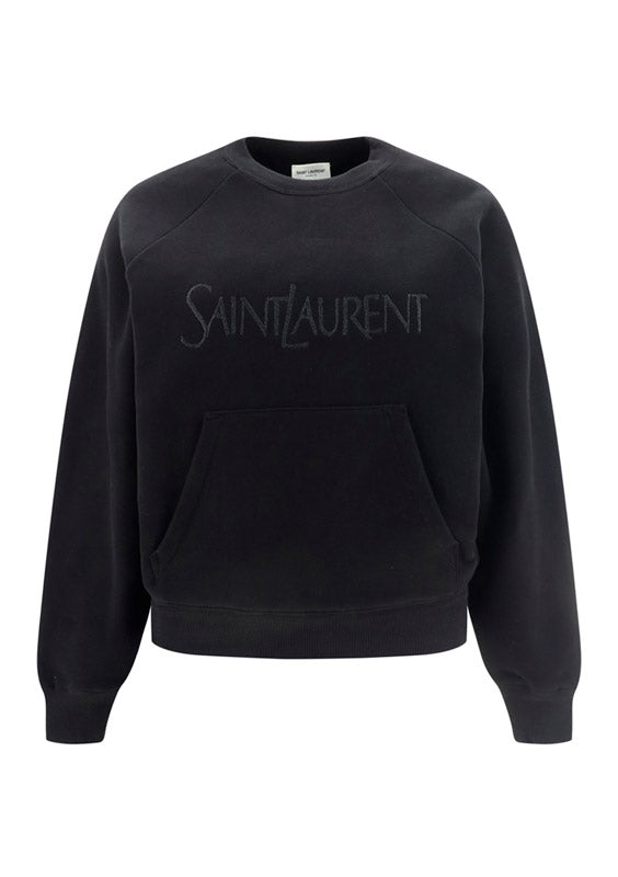 Woman's Cotton Sweatshirt by Saint Laurent, ribbed crew neck, iconic brand monogram applied tone-on-tone on front, monochrome design, kangaroo pocket on front, ribbed cuffs, ribbed hem.