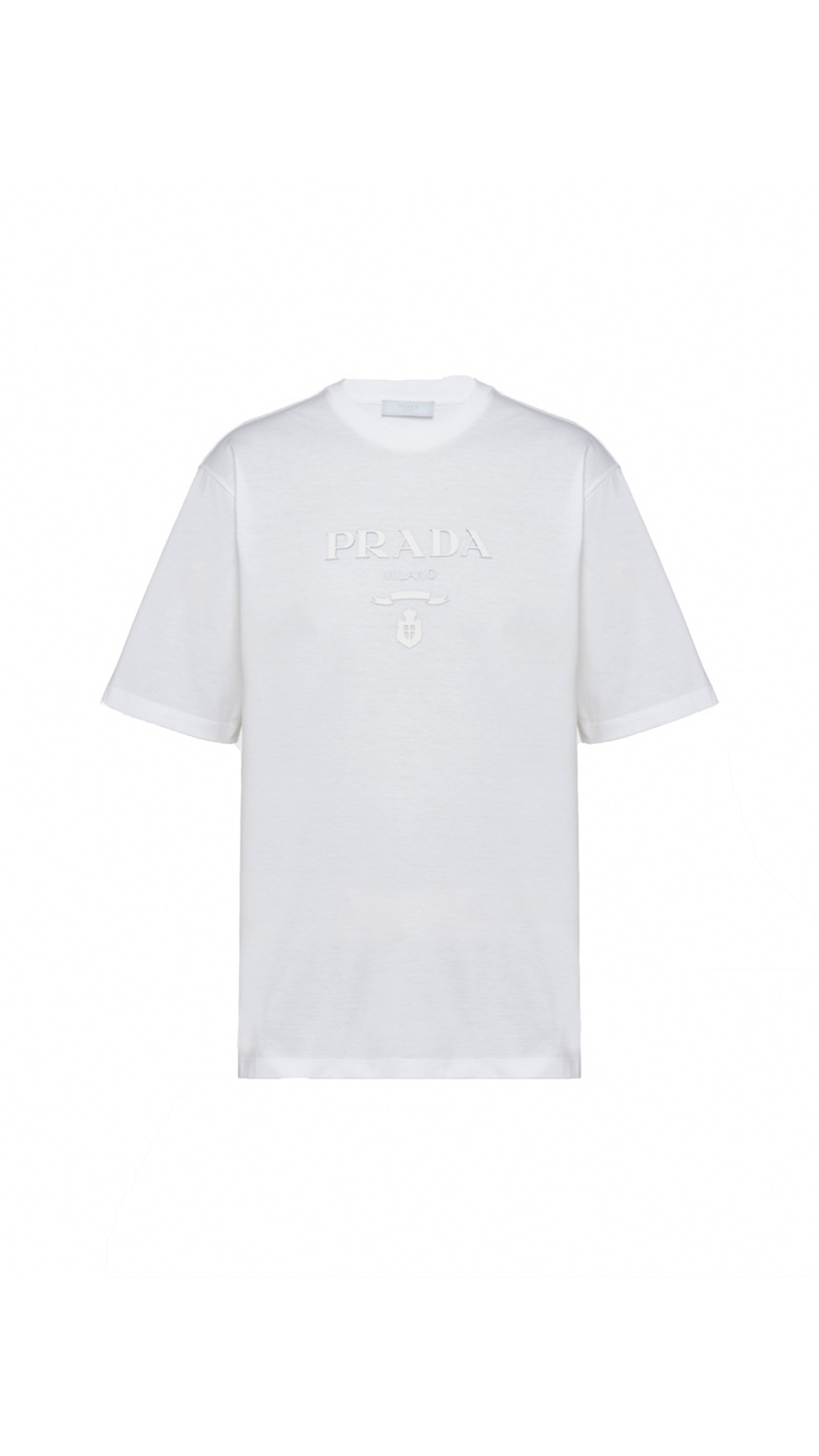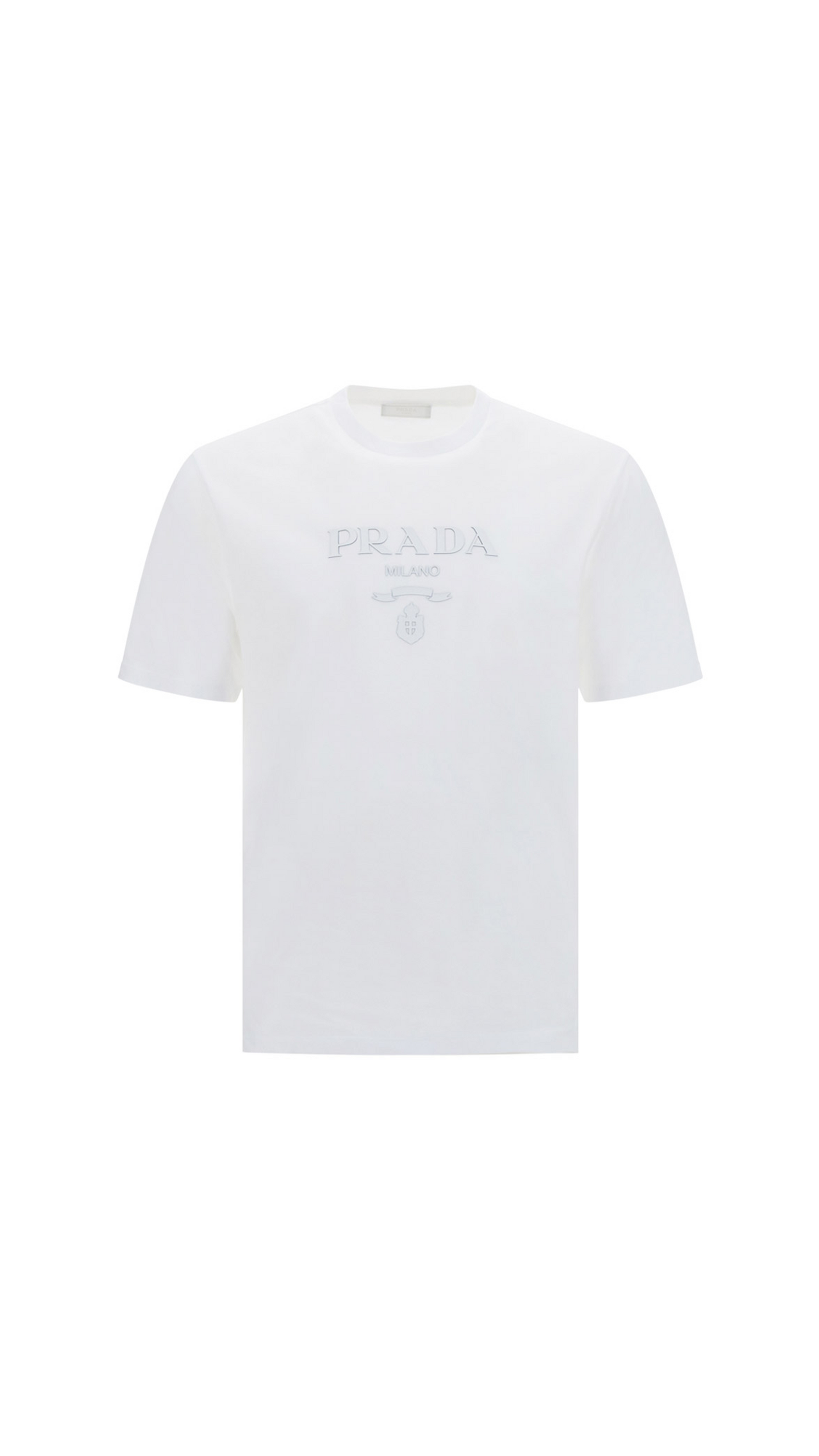 Men's Cotton T-Shirt by Prada, ribbed crew neck, iconic tone-on-tone brand monogram embroidered on the front.