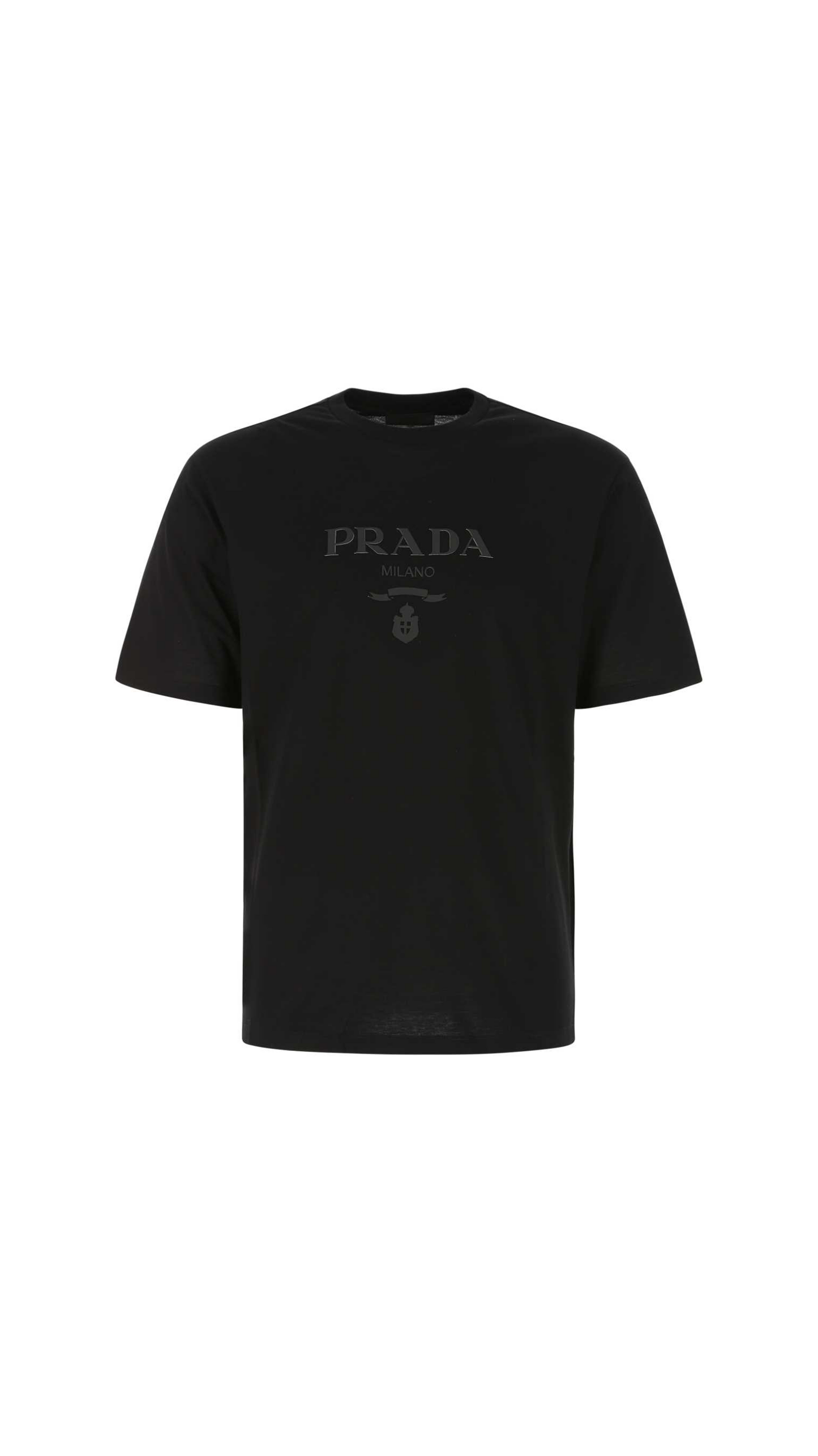 Cotton T-Shirt by Prada, ribbed crew neck, iconic tone-on-tone brand monogram embroidered on the front.