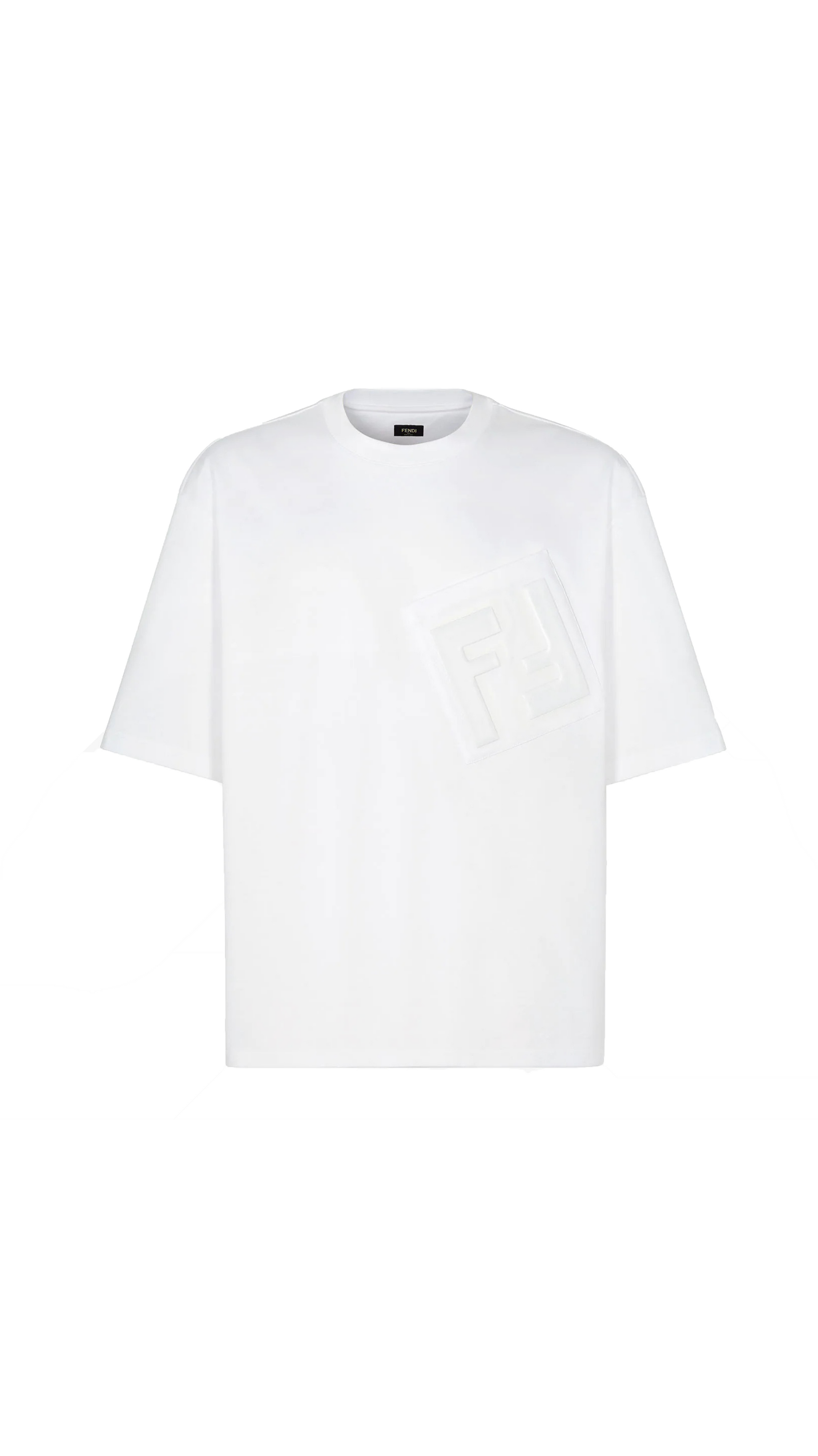 Men's Cotton T-Shirt by Fendi, ribbed crew neck, iconic brand monogram patch on front, oversize fit.