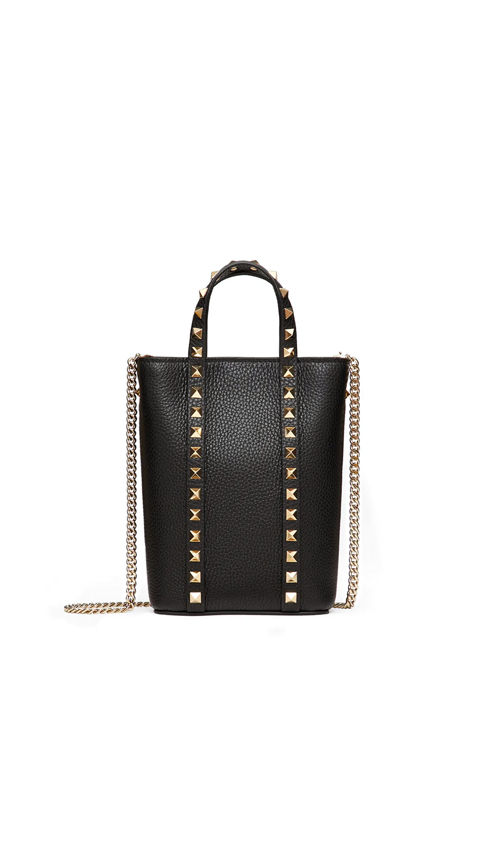 Calfskin Handbag by Valentino Garavani, grained leather design, interior snap-button closure, iconic all-over Rockstud studs appliqué, double handles, adjustable and removable chain shoulder strap, interior card slots, iconic brand monogram press-stamped on front.