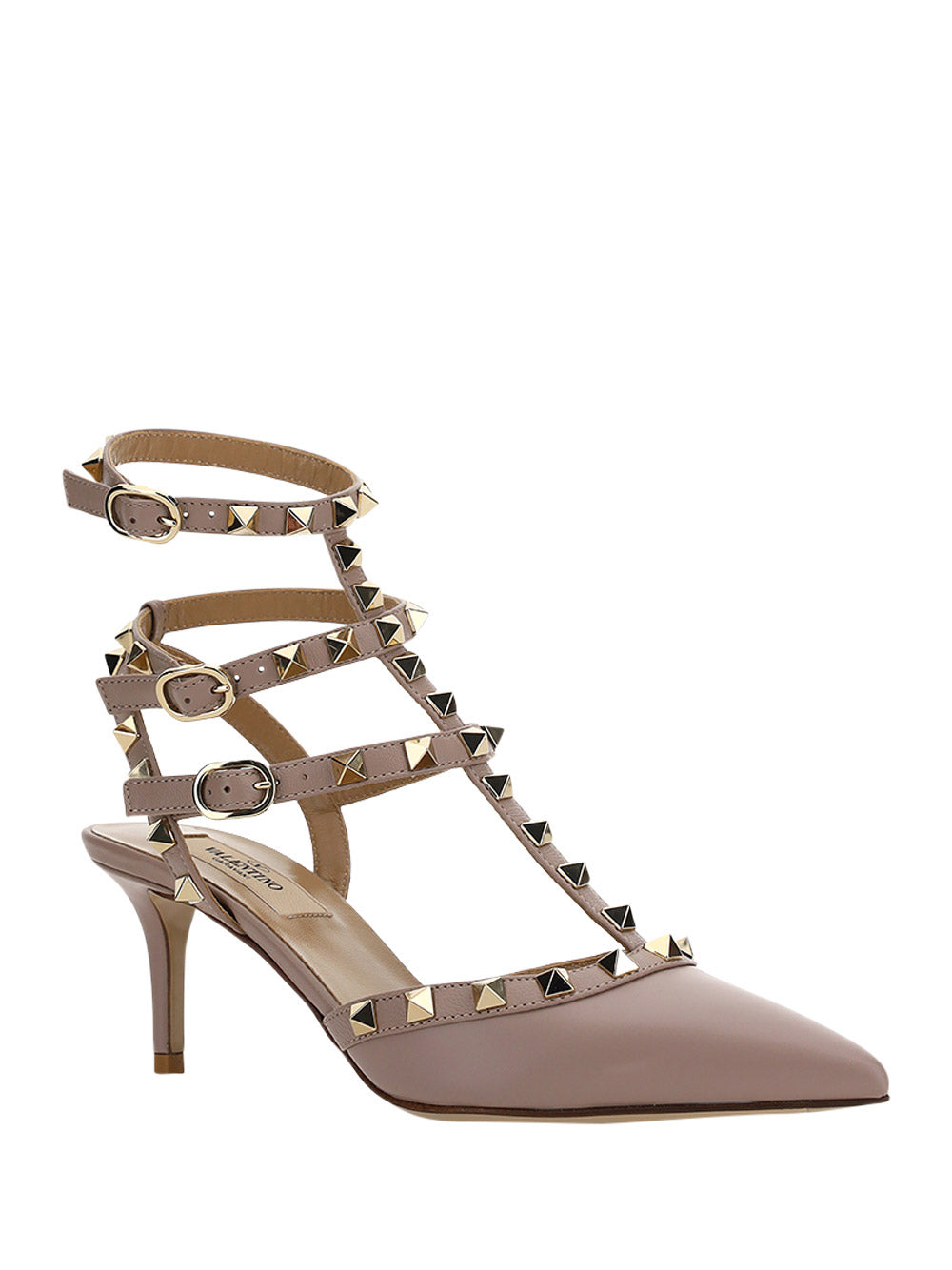 Lambskin Rockstud Sandals by Valentino Garavani, elongated almond toe, triple strap closure on adjustable ankle with side buckle, matte leather design, leather stiletto heel, brand's iconic all-over applied and gold-plated studs, logoed insole.